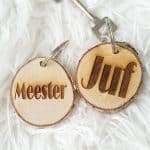 Rond houtschijfje als sleutelhanger gepersonaliseerd met je eigen logo en/of tekst.