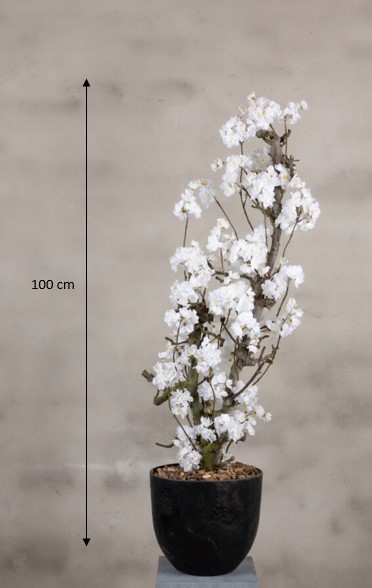Grote, witte appelbloesemstruik gemaakt van een natuurlijke perentak in combinatie met kunstbloesemtakken. De struik wordt standaard geleverd met een binnenpot van 15 x 19 cm. De hoogte van de bloesemstruik is ± 100 cm.