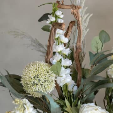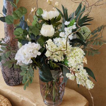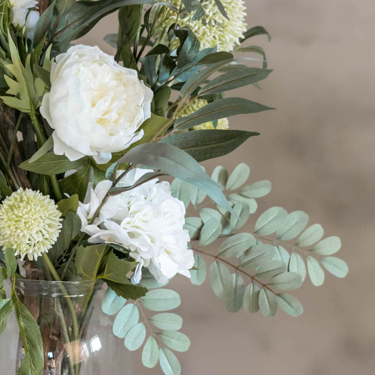 Zijden bloemen boeket, met kunstbloemen in de kleuren, groen en wit. Dit boeket past perfect in een elegant interieur! De hoogte van dit boeket is 80 centimeter. Het boeket wordt geleverd zonder vaas.