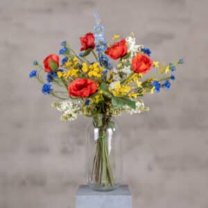 Kleurrijk zijden bloemen veldboeket met diverse zijden bloemen. Om zelf in een mooie vaas te zetten. De tinten die naar voren komen in dit veldboeket zijn geel, blauw, rood en wit. De hoogte van dit boeket is 80 centimeter. Dit kunst veldboeket wordt geleverd zonder vaas.
