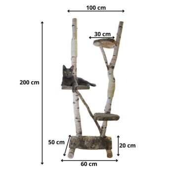 Robuuste berken krabpaal met halve boomstam als voet. Inclusief krabtouw en drie zitjes voor jouw kat. Naar keus verkrijgbaar in drie kleuren stof zodat hij of zij heerlijk zacht ligt. Hoogte 200 cm, breedte 100cm.