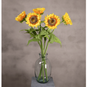 Kunstboeket in vrolijke zonnebloemen van hoogwaardige kwaliteit. In een mooie vaas heb je altijd een prachtig boeket op tafel staan. Mooi voor in huis, maar ook erg geschikt voor op jouw bedrijf, omdat het zeer onderhoudsvriendelijk is. De hoogte van dit boeket is 80 centimeter.