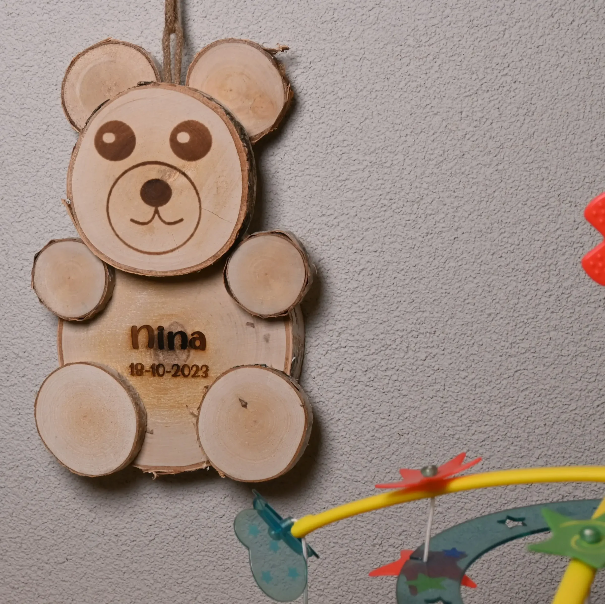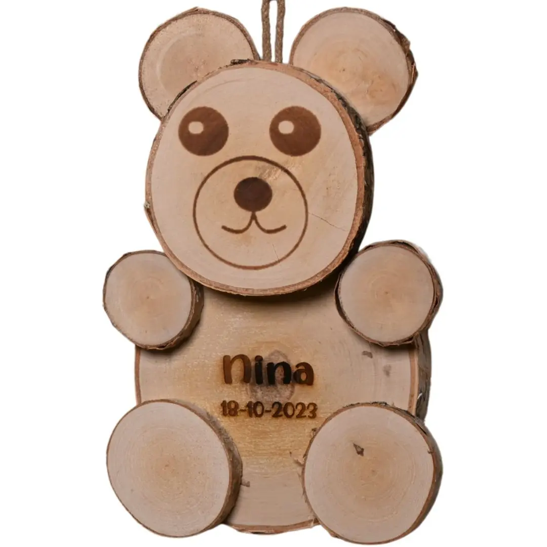 Deze berkenhouten beer met persoonlijke gravering is een uniek en warm cadeau. De beer wordt met de hand vervaardigd uit natuurlijke berkenhouten schijven met bast, wat zorgt voor een charmante, rustieke uitstraling. Dankzij de zachte houtkleur past hij prachtig in ieder interieur – van kinderkamer tot woonkamer.