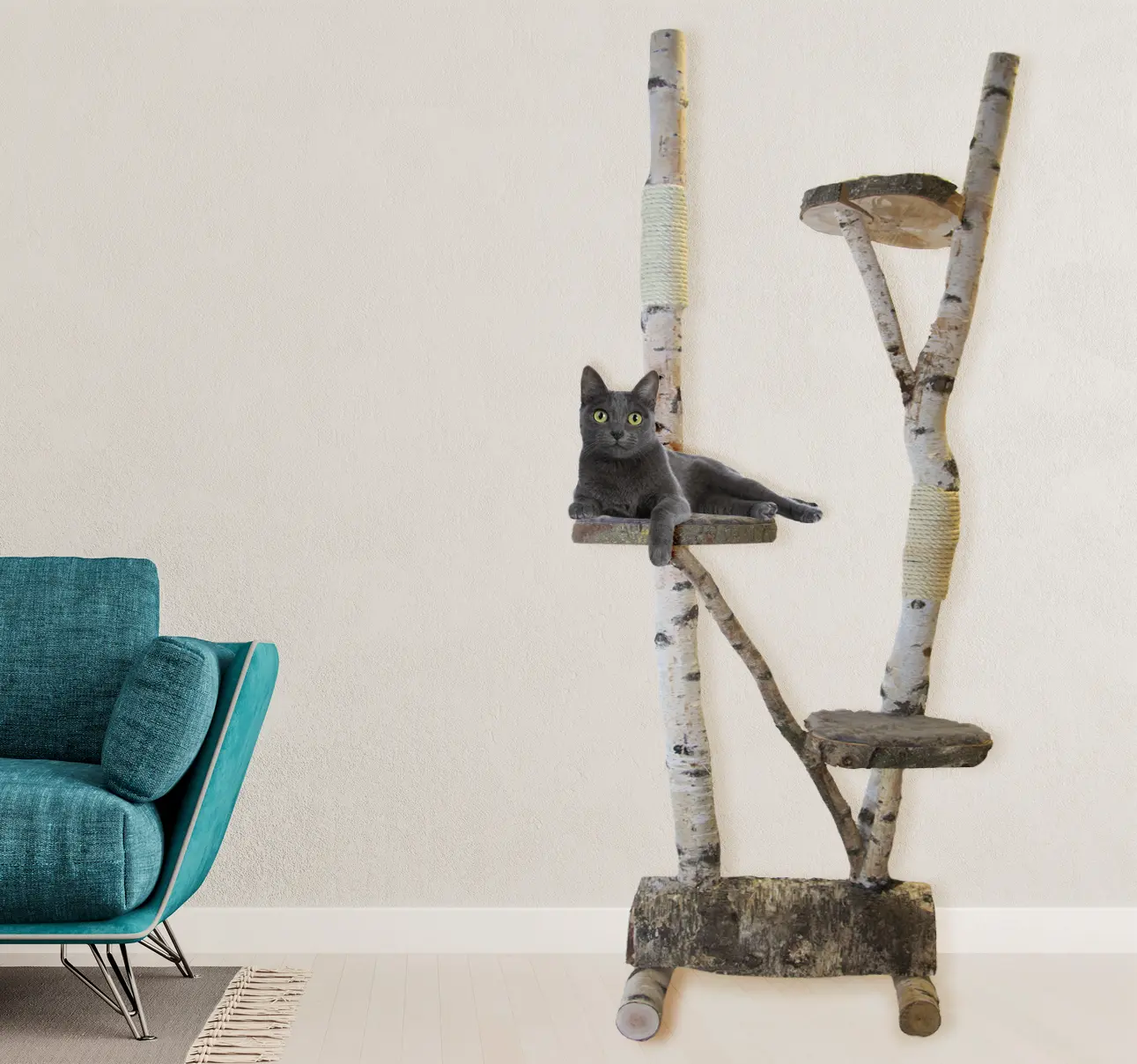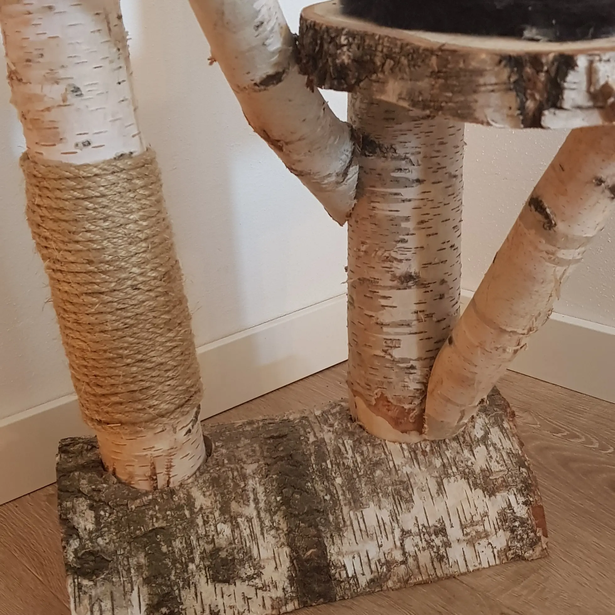 De berken krabpaal Mimi is een unieke en natuurlijke krabpaal, gemaakt van robuuste berkenstammen. Dankzij de stevige constructie en de verschillende plateaus biedt deze krabpaal jouw kat volop mogelijkheden om te spelen, klimmen, rusten en uitkijken.