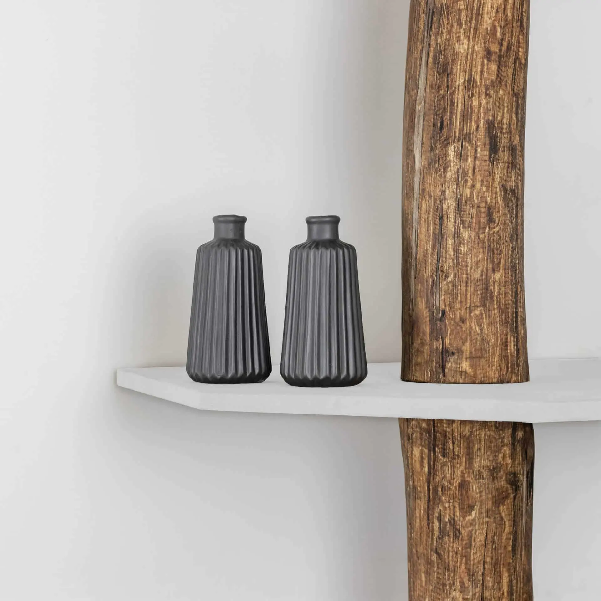 Alrik boomstam hoekkast met natuurlijke boomstam behandeld met een Oak olie en 4 witte hoekplanken.