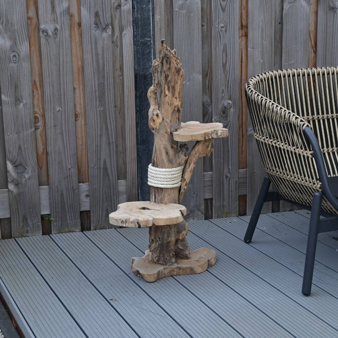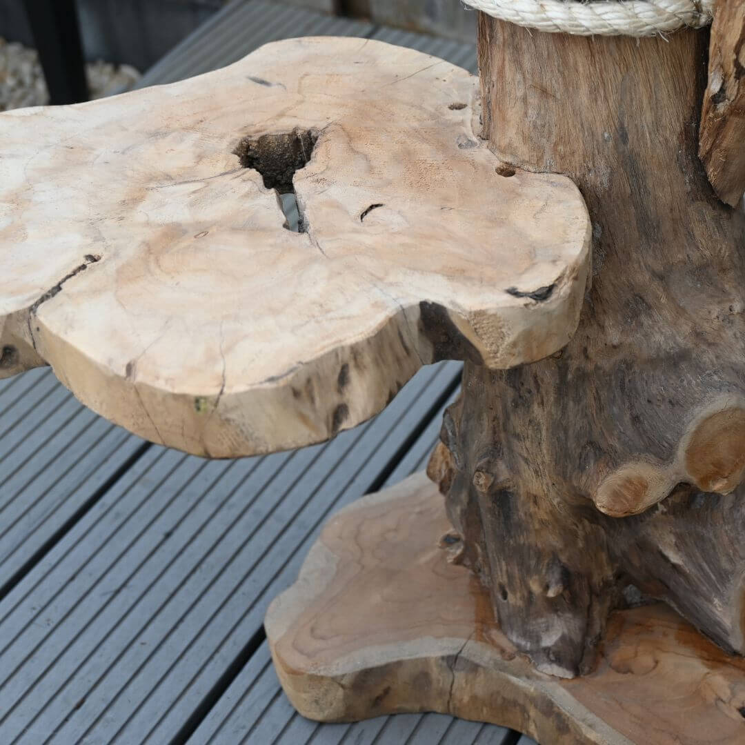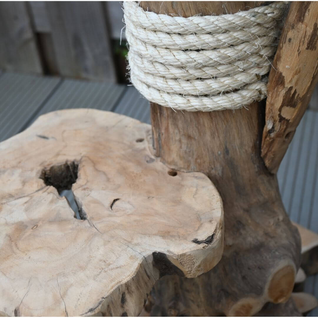 Dankzij de warme houtkleur en natuurlijke afwerking past deze teak krabpaal perfect in landelijke, industriële of bohemian interieurs — een stijlvol alternatief voor standaard kattenspullen.