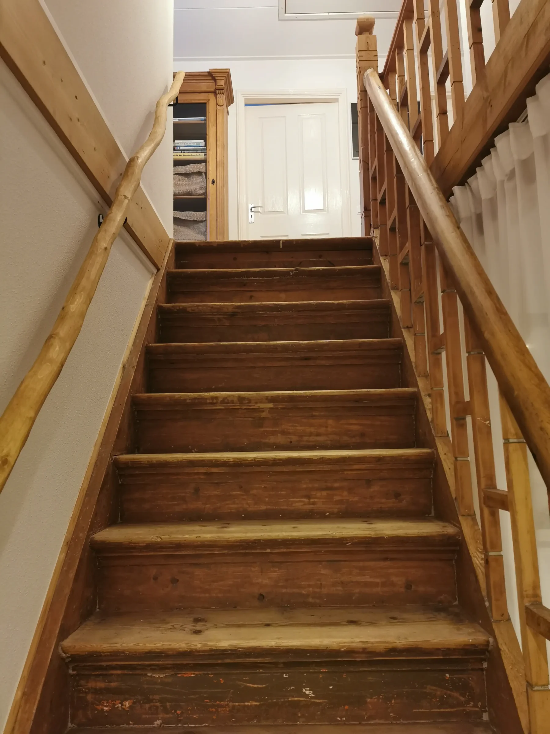 De rechte trapleuning is met zorg geselecteerd op een rustige vorm, maar blijft altijd licht organisch — nooit volledig kaarsrecht, want elke stam behoudt zijn natuurlijke karakter. De gekronkelde variant is juist gekozen op extra mooie bochten en speelse lijnen, ideaal voor wie de charme van puur natuur nog sterker wil benadrukken. Voor trappen met een bijzondere vorm kan de leuning ook met een op maat gemaakte buiging worden geleverd, zodat deze perfect aansluit.