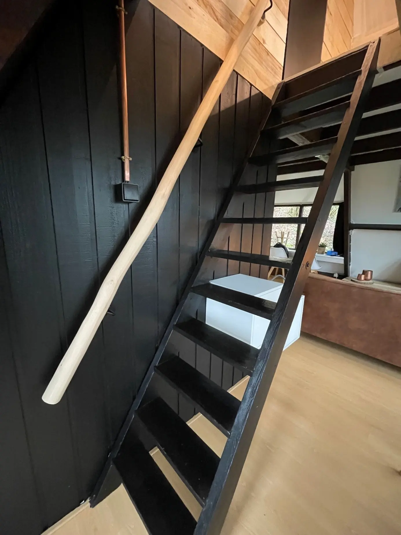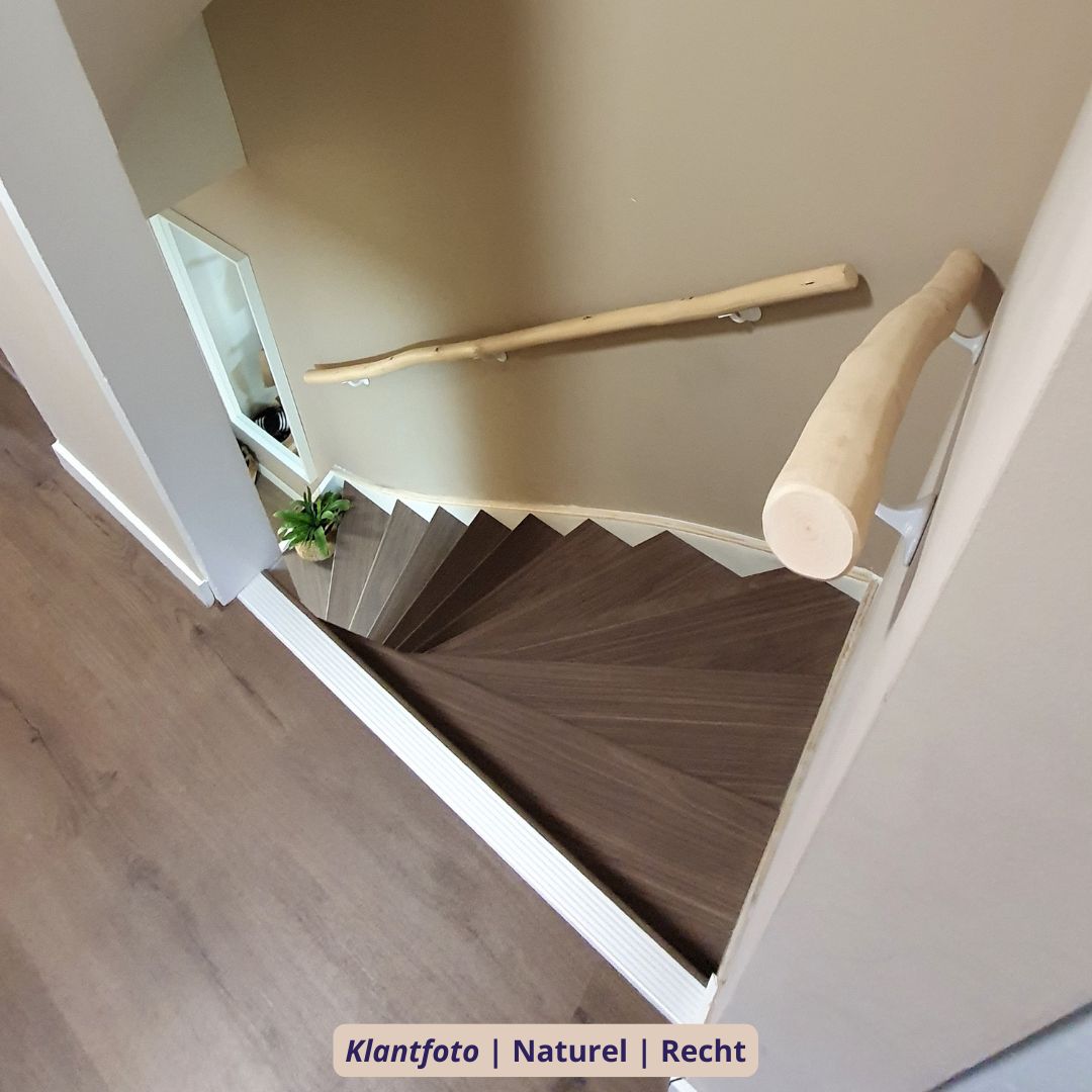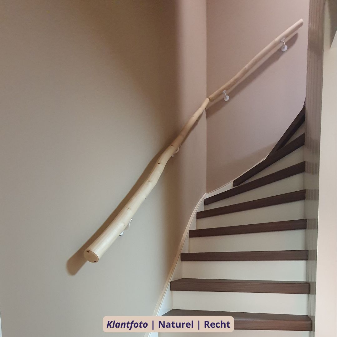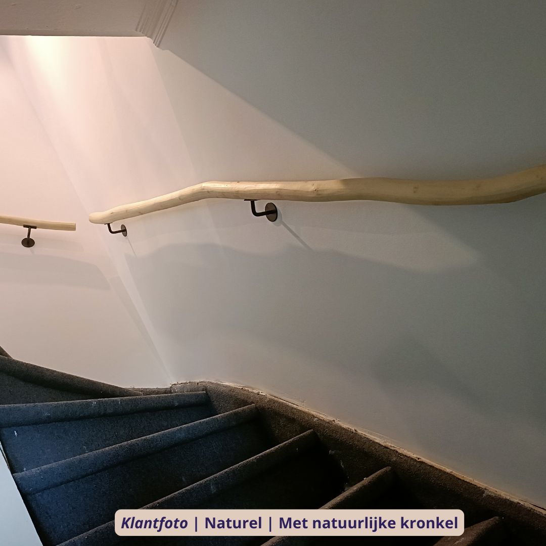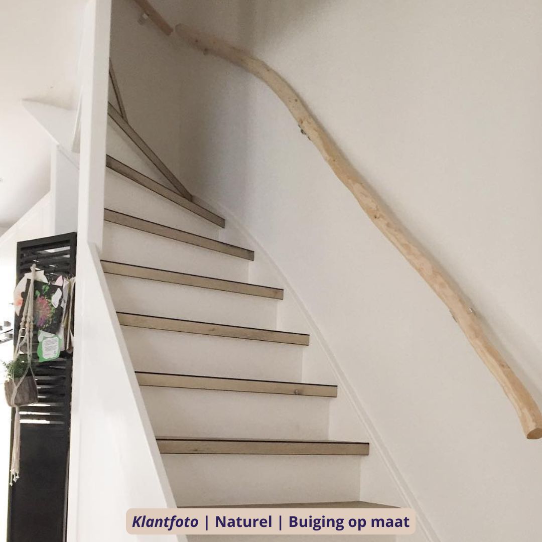 De rechte trapleuning is met zorg geselecteerd op een rustige vorm, maar blijft altijd licht organisch — nooit volledig kaarsrecht, want elke stam behoudt zijn natuurlijke karakter. De gekronkelde variant is juist gekozen op extra mooie bochten en speelse lijnen, ideaal voor wie de charme van puur natuur nog sterker wil benadrukken. Voor trappen met een bijzondere vorm kan de leuning ook met een op maat gemaakte buiging worden geleverd, zodat deze perfect aansluit.