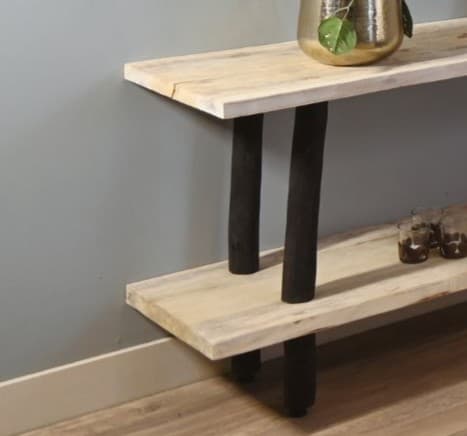 Geef je woonkamer een natuurlijke eyecatcher met boomstam TV‑meubel Magnus. Het meubel combineert diepzwarte boomstampoten met massieve, geschuurde legplanken. De organische vormen van de stammen en de rustige tekening van het loofhout zorgen voor een uniek contrast: rauw, maar verfijnd.