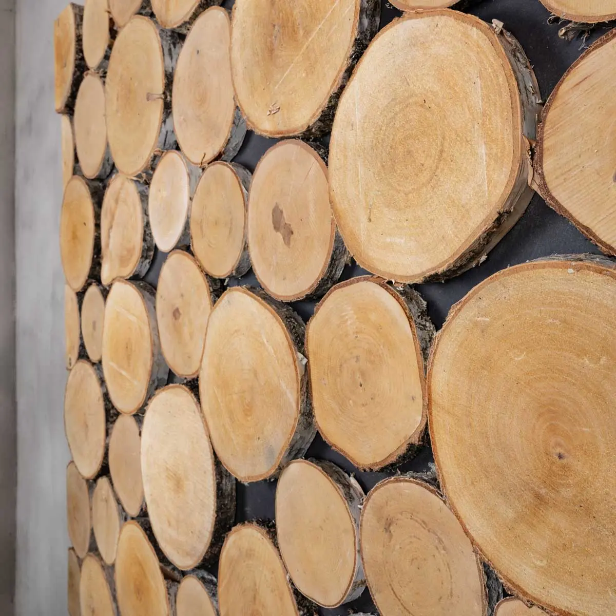Elke schijf is zorgvuldig geselecteerd en bevestigd op een stevige ondergrond, waardoor een harmonieus geheel ontstaat. De natuurlijke kleur van het berkenhout combineert prachtig met het donkere contrast van de achtergrond, wat de tekening van het hout extra laat spreken.