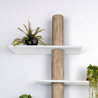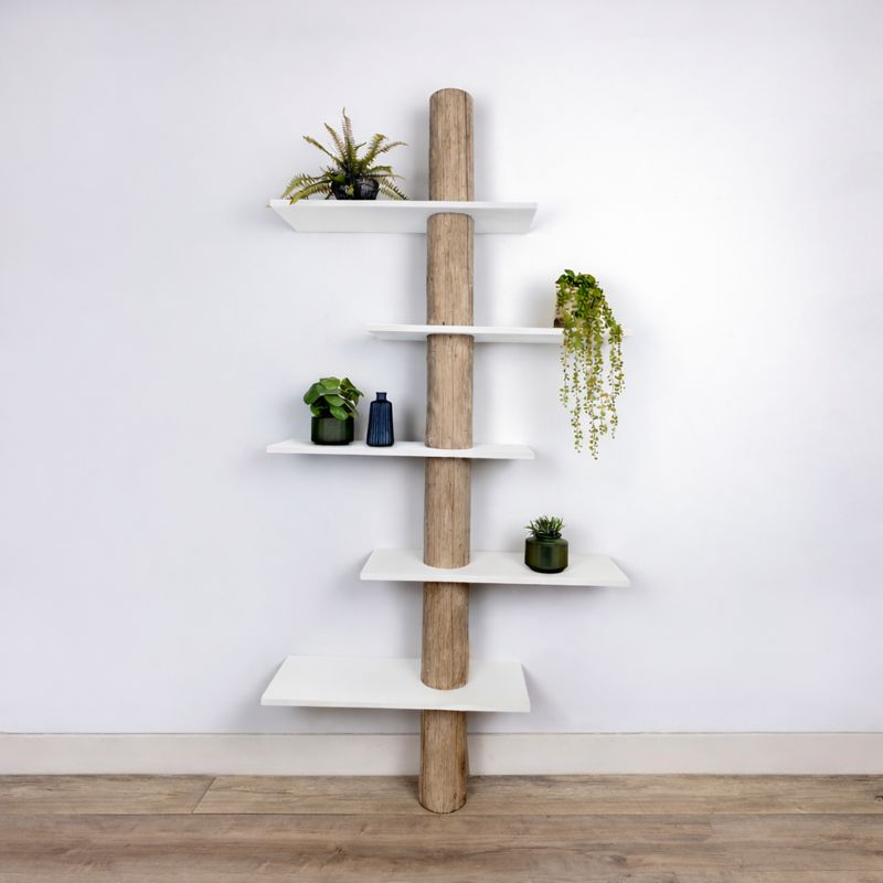 Wandkast Javi combineert de warmte van echt hout met het grafische effect van strakke, witte planken. Een echte boomstam vormt de verticale ruggengraat en afgewerkt met een Grey wash olie krijgt hij een warme en sfeervolle look; zijn organische vorm contrasteert mooi met de strak uitgevoerde planken die rondom de stam lijken te zweven. De planken zijn verspringend geplaatst voor een speels, ruimtelijk ritme en bieden genoeg plek voor boeken, planten en decor.
