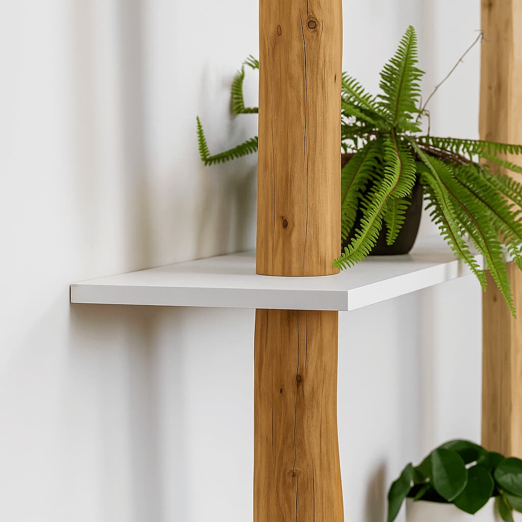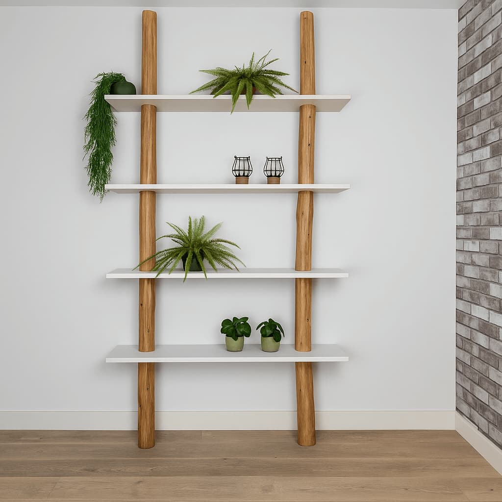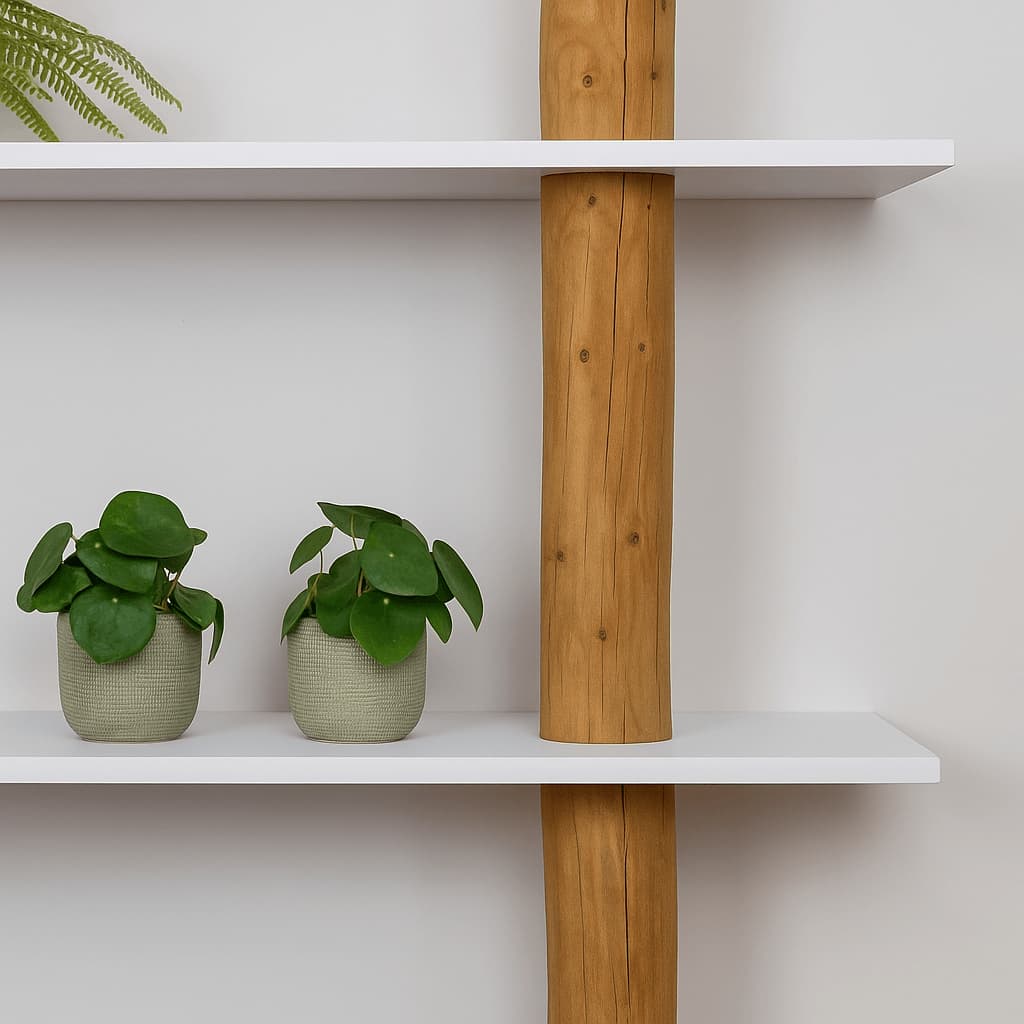 Dit wandrek combineert de authenticiteit van twee natuurlijke boomstammen met de strakke uitstraling van witte MDF planken. De planken zijn recht geplaatst voor een rustige en symmetrische look. Een echte boomstam vormt de verticale ruggengraat en met zijn organische vorm contrasteert dit mooi met de strak uitgevoerde, witte planken. De massieve stam is afgewerkt met een warme Old Naturel olie, waardoor hij extra diepte en karakter krijgt.