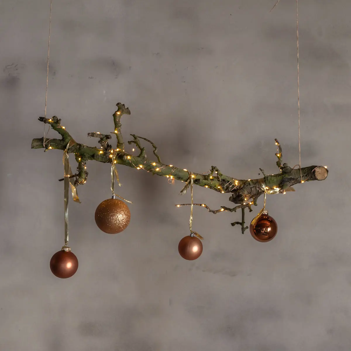 Deze guirlande van een natuurlijke perentak mét bast heeft een robuuste, authentieke uitstraling en behoudt volledig het karakter van echt hout. De grillige vormen, knoesten en ruwe bast geven de tak een pure, natuurlijke charme, perfect voor een warme en sfeervolle kerststyling boven de eettafel, in een etalage of tegen een muur.