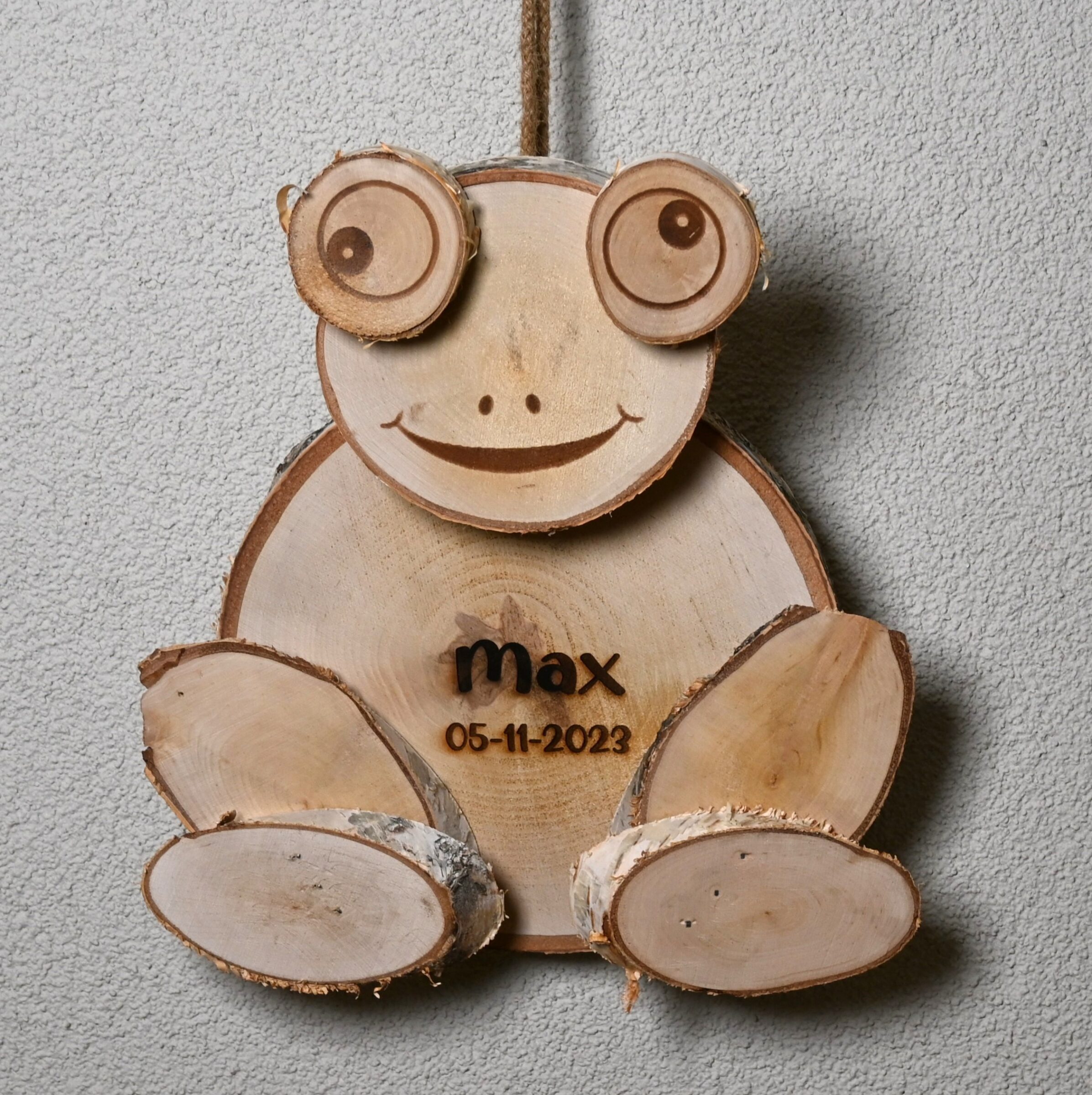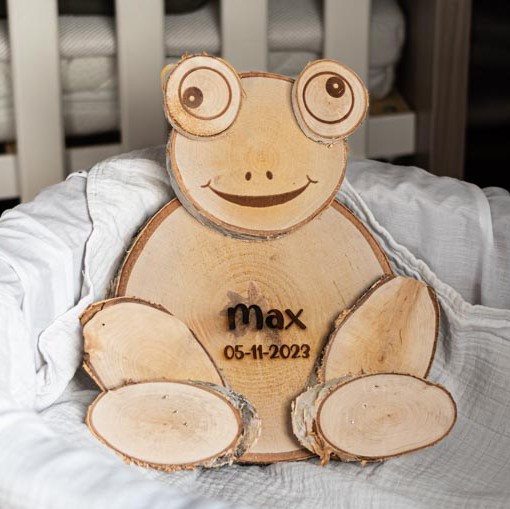 Elke kikker wordt volledig gepersonaliseerd met een eigen naam, datum, tekst of symbool naar keuze. De gravure wordt zorgvuldig in het hout gebrand, waardoor de opdruk permanent en stijlvol zichtbaar blijft.