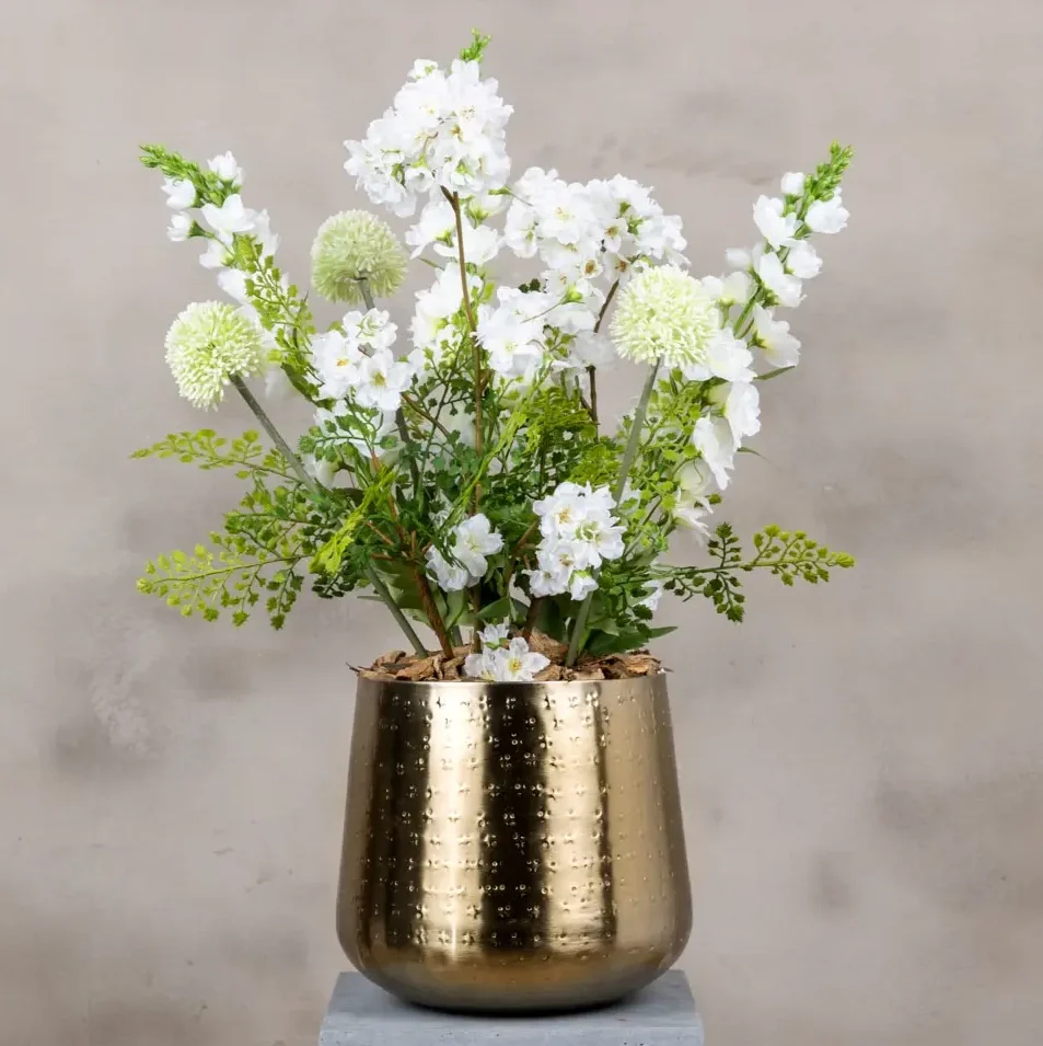 Het bloemstuk wordt standaard geleverd in een binnenpot, maar is ook te bestellen met een divers aanbod aan overpotten waardoor het niet alleen natuurlijk oogt maar ook een chique en moderne toevoeging is aan elk interieur. Dankzij de hoogwaardige kunstmaterialen blijft dit stuk jarenlang mooi, zonder verzorging of water.
