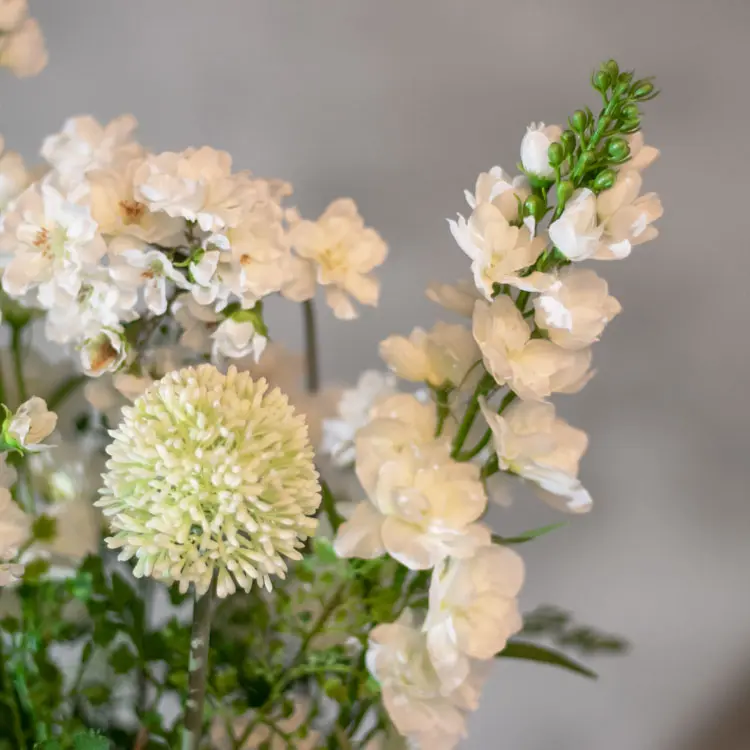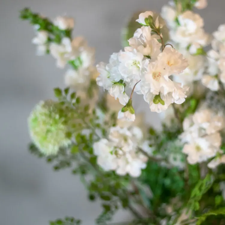 Het kunstbloemstuk Ophelia brengt een frisse en verfijnde sfeer in huis. De witte bloemtrossen in combinatie met zachte groentinten en speelse varenbladeren zorgen voor een luchtig en natuurlijk geheel. Dankzij de rijke samenstelling oogt dit bloemstuk heel natuurlijk en levensecht.