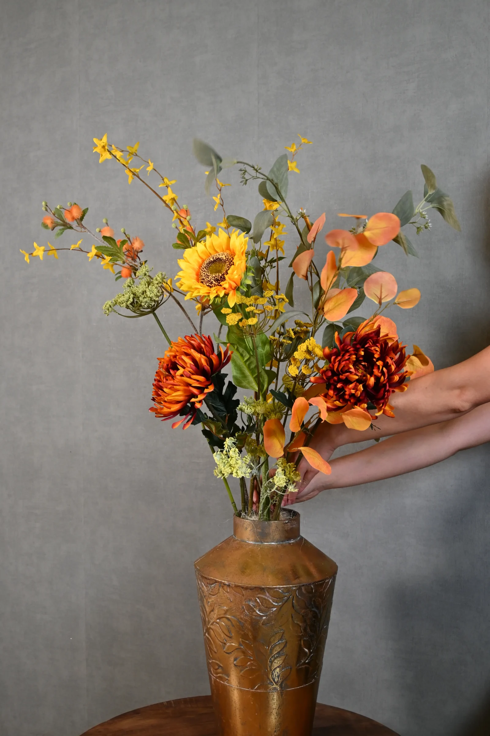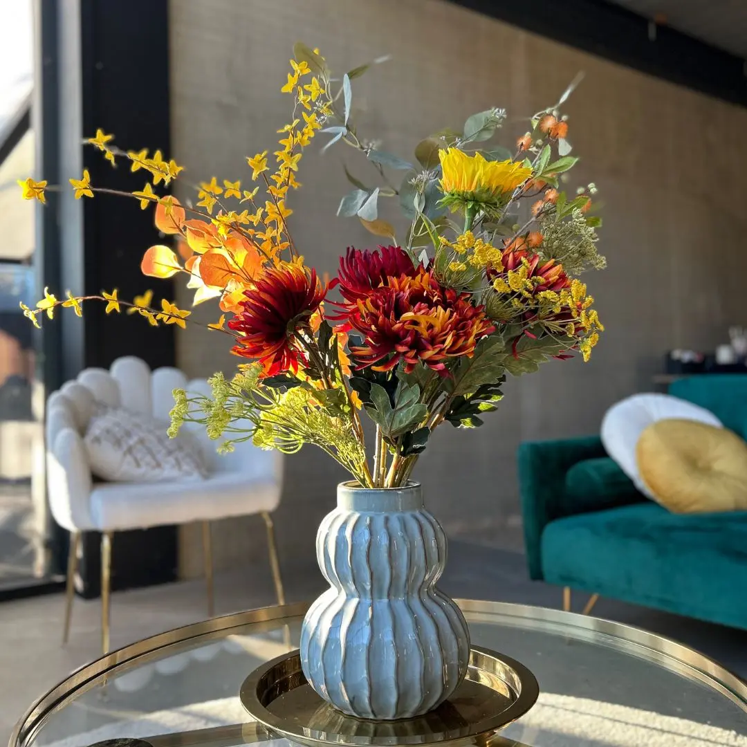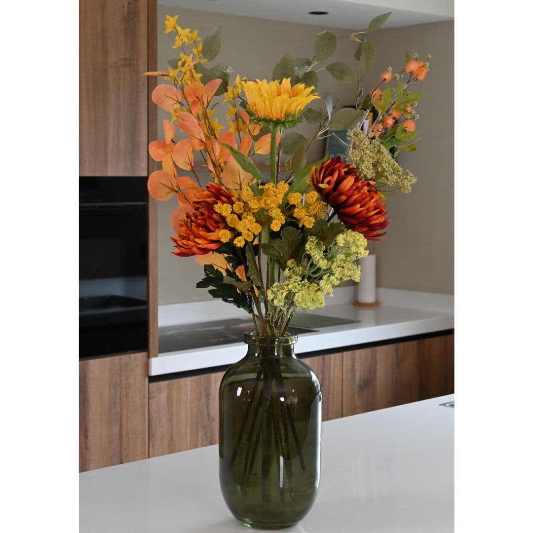 Kunstboeket Gouden gloed brengt warmte en elegantie in je interieur. De combinatie van diep oranje, goudgeel, roestbruin en fris groen zorgt voor een luxe en sfeervolle uitstraling. De zonnebloem en warme accentbloemen geven dit boeket een sprankelende, bijna herfstige gloed die direct sfeer toevoegt.