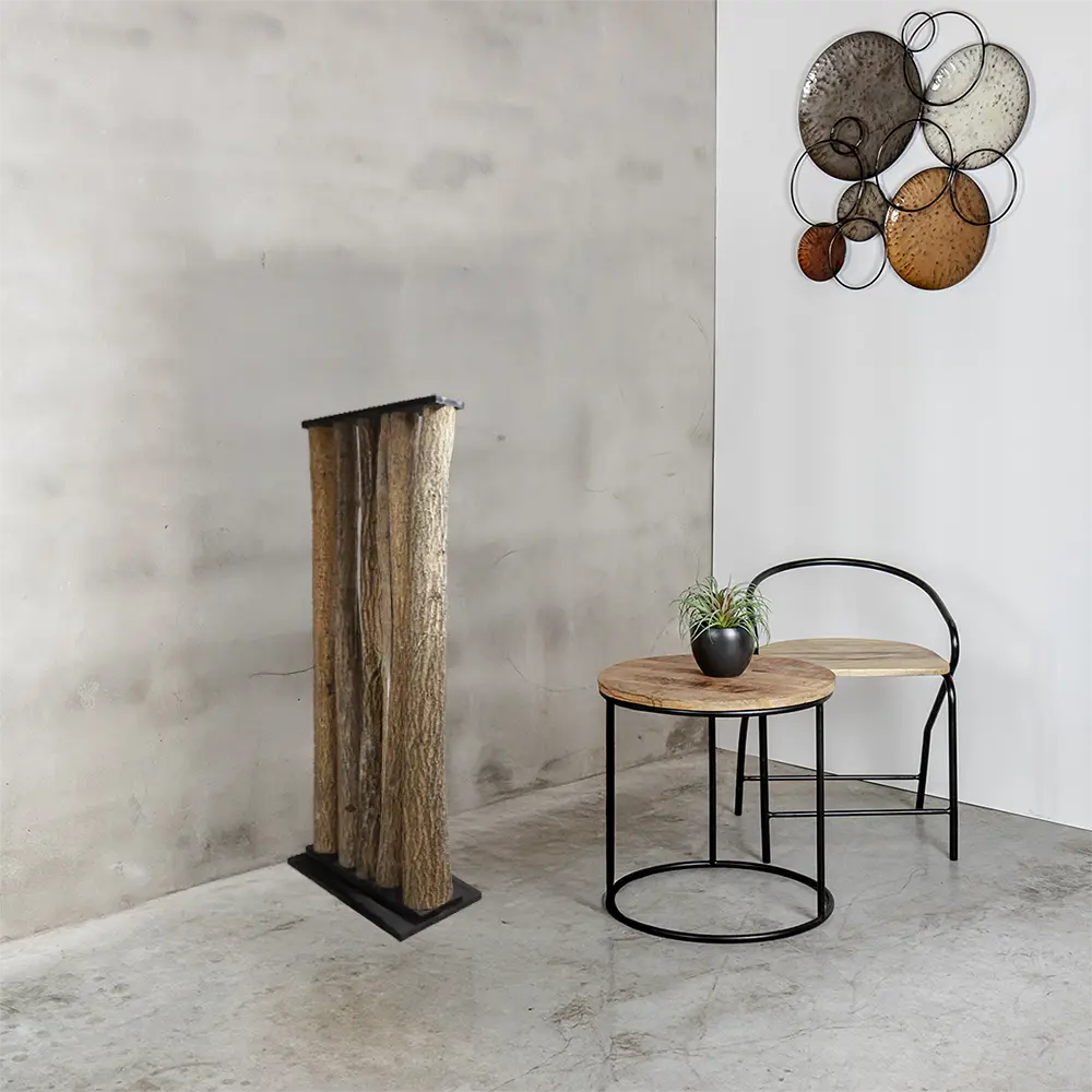 De stammen zijn stevig geplaatst in een zwarte voet, die zorgt voor stabiliteit en een stijlvol contrast met het natuurlijke hout. Deze combinatie maakt de roomdivider geschikt voor zowel landelijke interieurs als moderne ruimtes waar een stoere, organische blikvanger gewenst is.