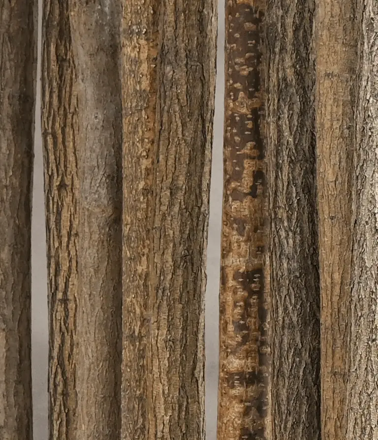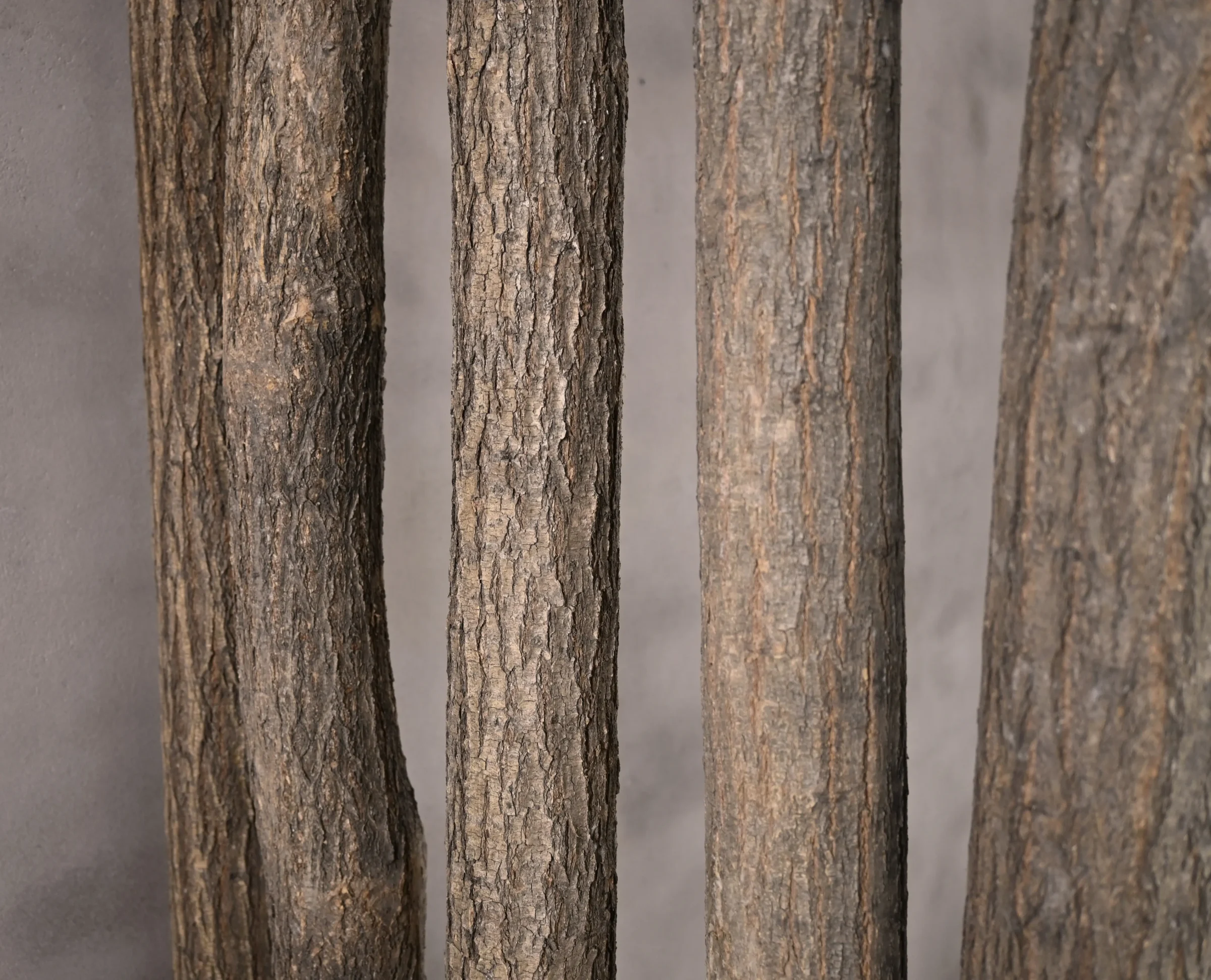 De Elin roomdivider is gemaakt van originele lindenstammen met bast, wat zorgt voor een warme en karaktervolle uitstraling. Elke stam heeft een unieke structuur, waardoor geen enkele roomdivider hetzelfde is. De bast is bewust behouden om het ruige, natuurlijke karakter te benadrukken.