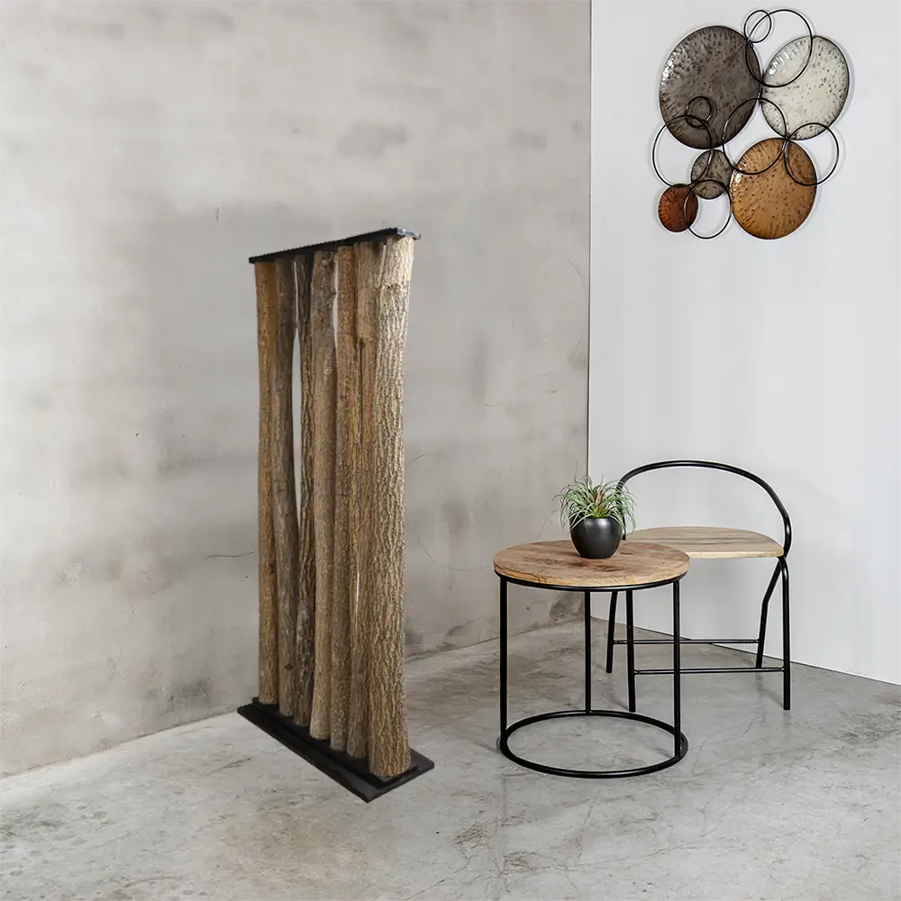 De stammen zijn stevig geplaatst in een zwarte voet, die zorgt voor stabiliteit en een stijlvol contrast met het natuurlijke hout. Deze combinatie maakt de roomdivider geschikt voor zowel landelijke interieurs als moderne ruimtes waar een stoere, organische blikvanger gewenst is.
