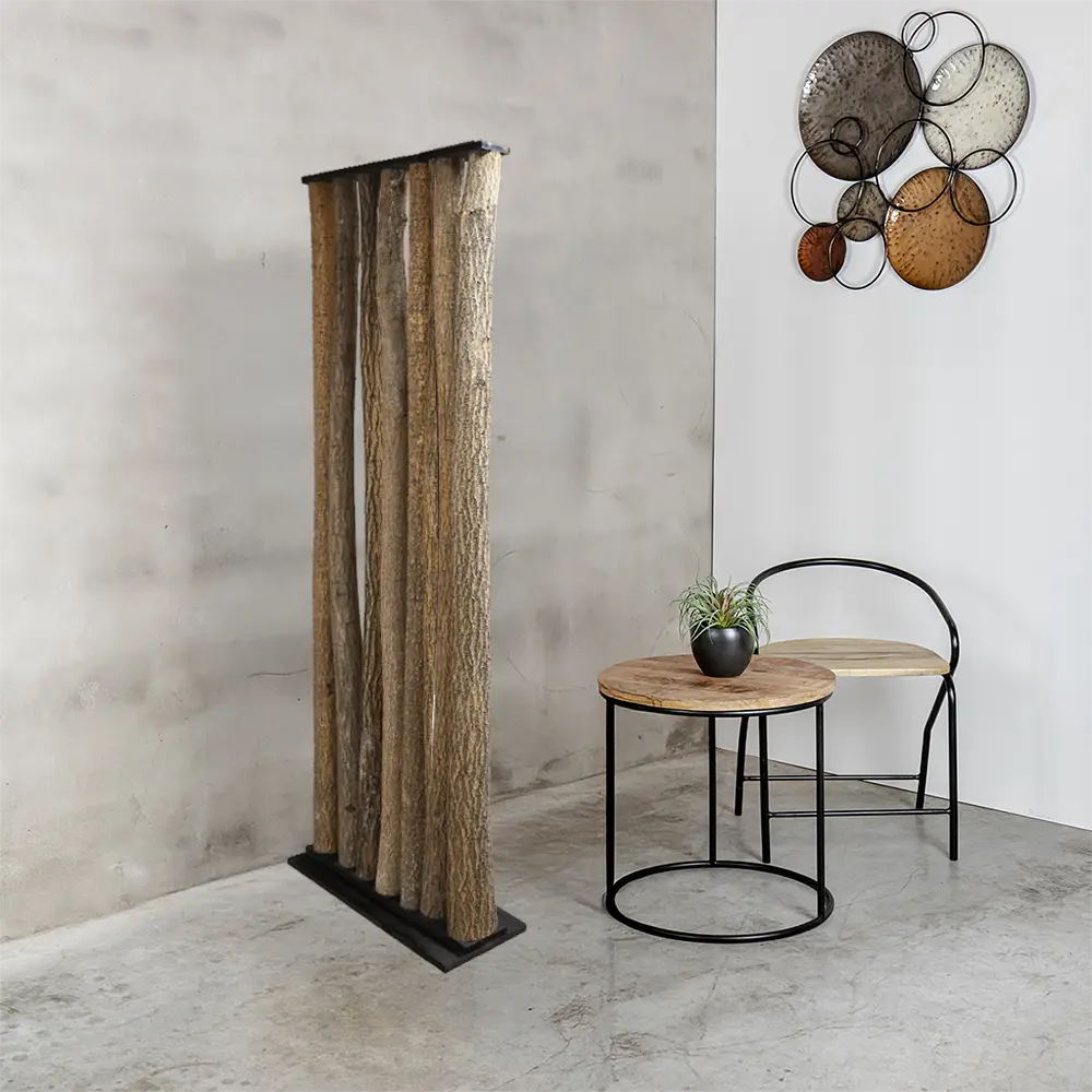De stammen zijn stevig geplaatst in een zwarte voet, die zorgt voor stabiliteit en een stijlvol contrast met het natuurlijke hout. Deze combinatie maakt de roomdivider geschikt voor zowel landelijke interieurs als moderne ruimtes waar een stoere, organische blikvanger gewenst is.