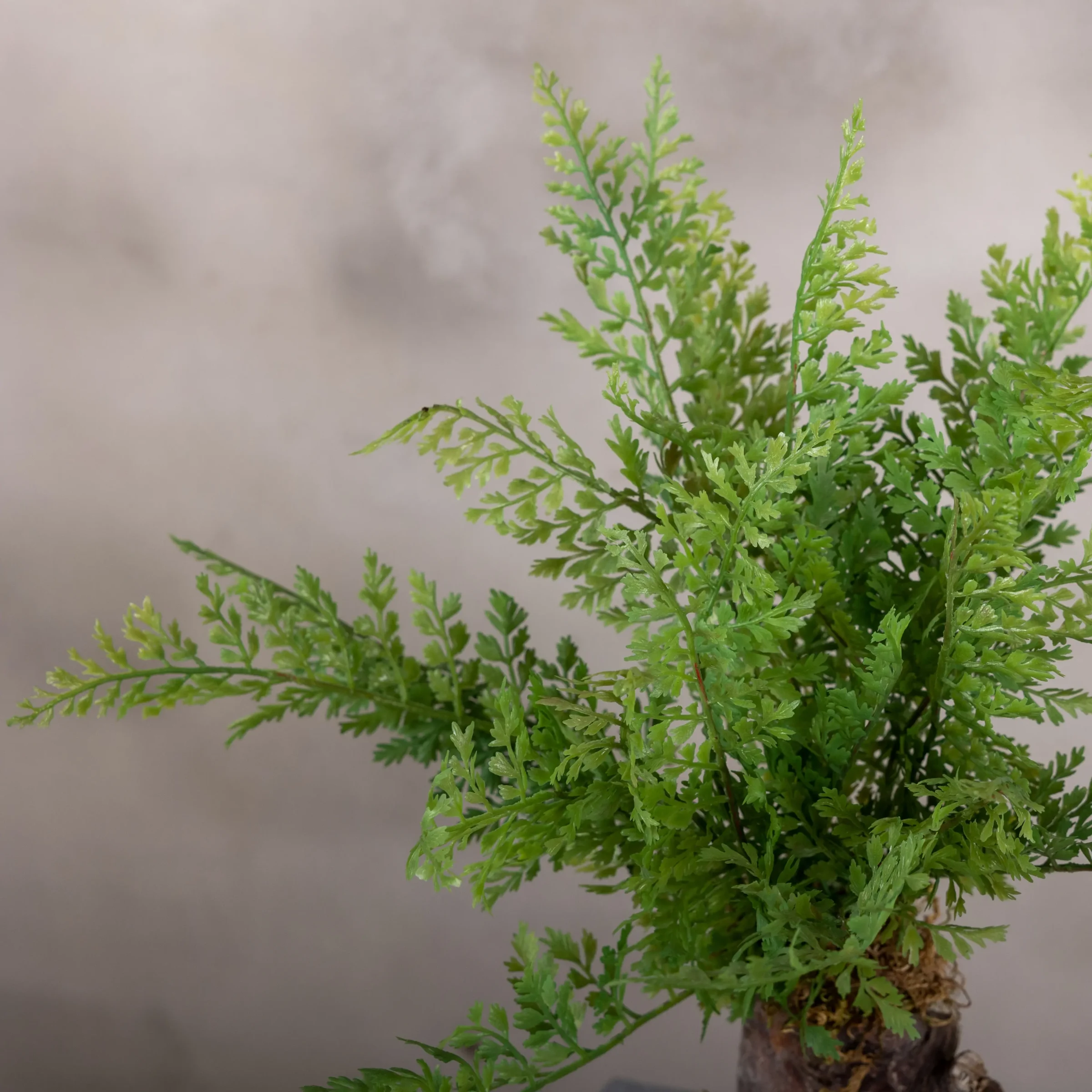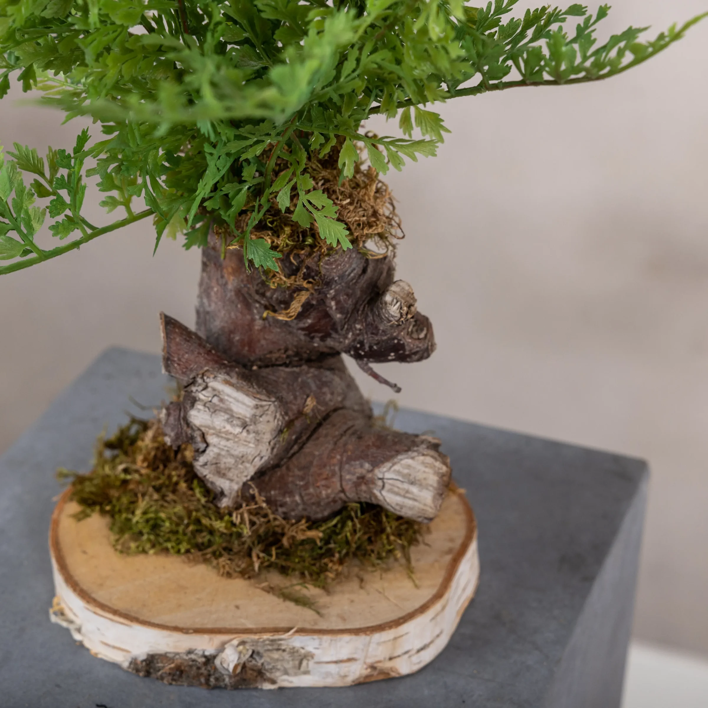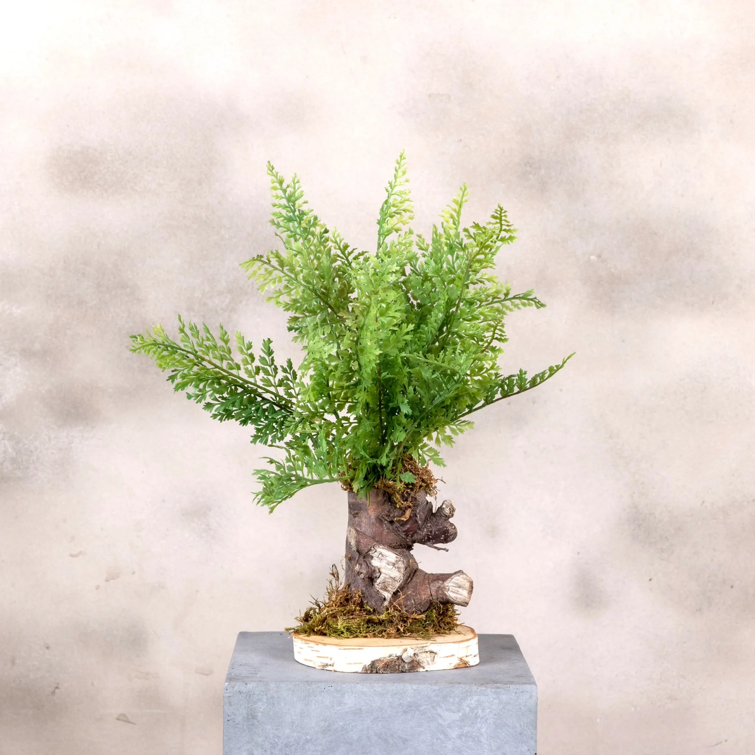 Het miniboompje Varen fijn is een sfeervol en natuurlijk woonaccessoire dat direct een vleugje bos in huis haalt. De volle, frisgroene varens steken sierlijk uit de robuuste houten stam, waarbij de toevoeging van mos zorgt voor een natuurlijke en speelse afwerking.