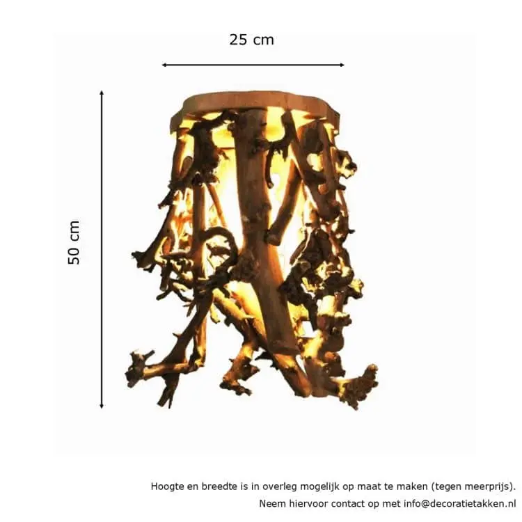 Dankzij het natuurlijke karakter en de ambachtelijke afwerking is geen enkel exemplaar hetzelfde — elke lamp heeft zijn eigen karakter en uitstraling. De combinatie van het ruwe hout en het subtiele licht zorgt voor een warme, sfeervolle gloed in de ruimte.