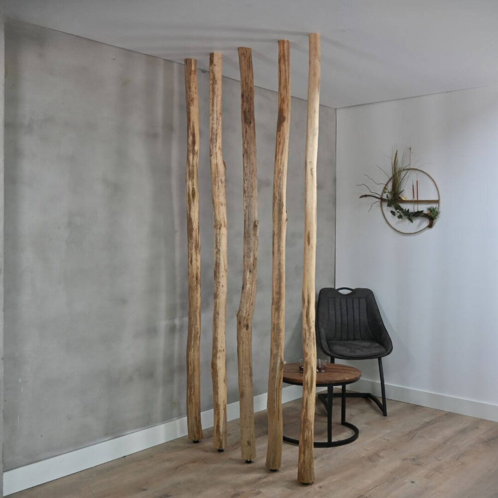 Dankzij de verstelbare stelschroef aan de onderzijde zijn de stammen stevig te plaatsen tussen vloer en plafond — ideaal voor gebruik als roomdivider, wanddecoratie of plantensteun. De hoogte is verstelbaar, waardoor ze geschikt zijn voor vrijwel iedere standaard plafondhoogte.