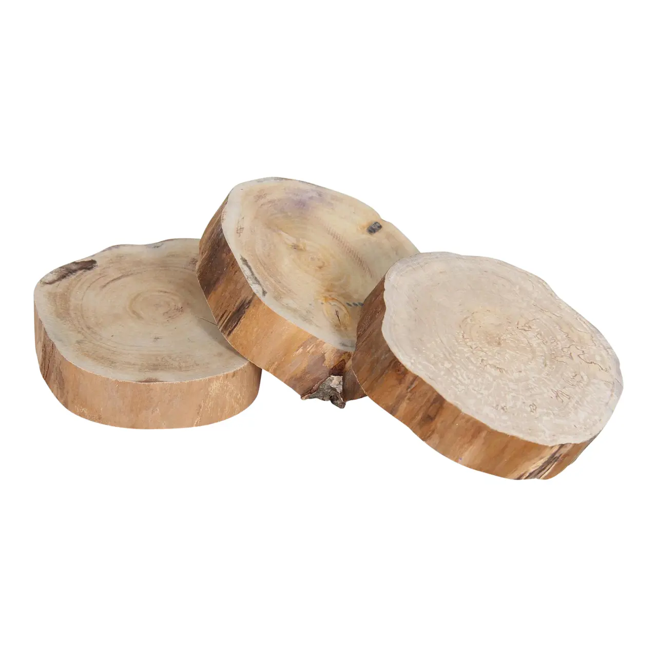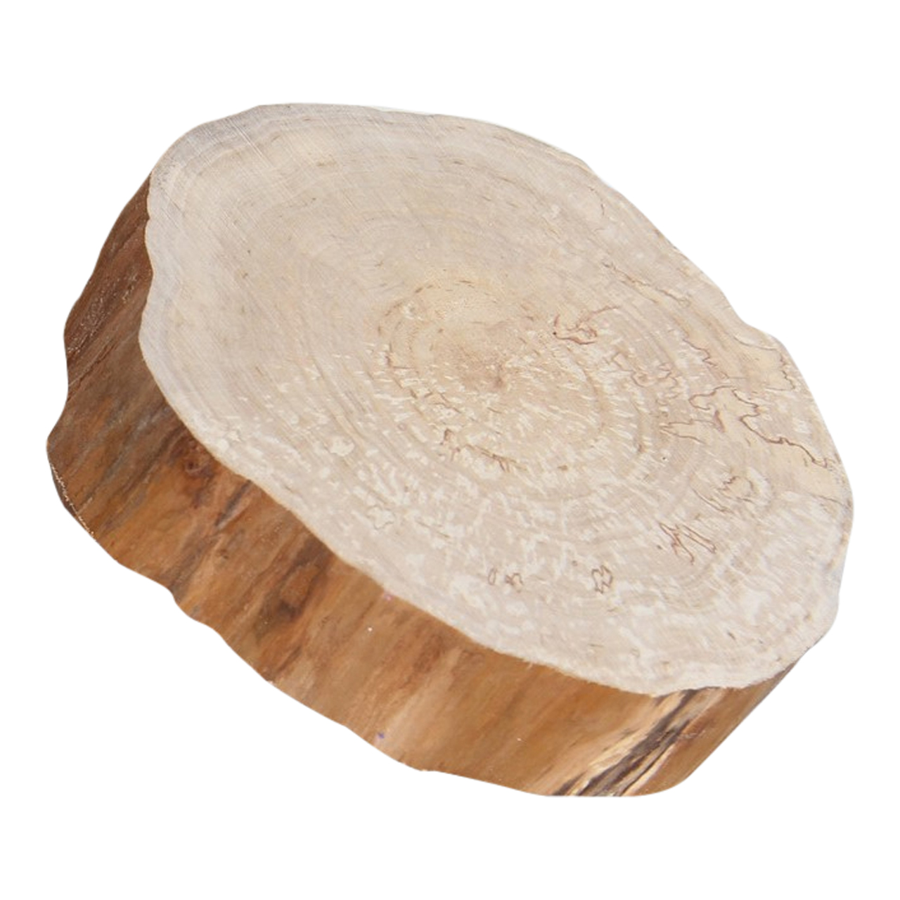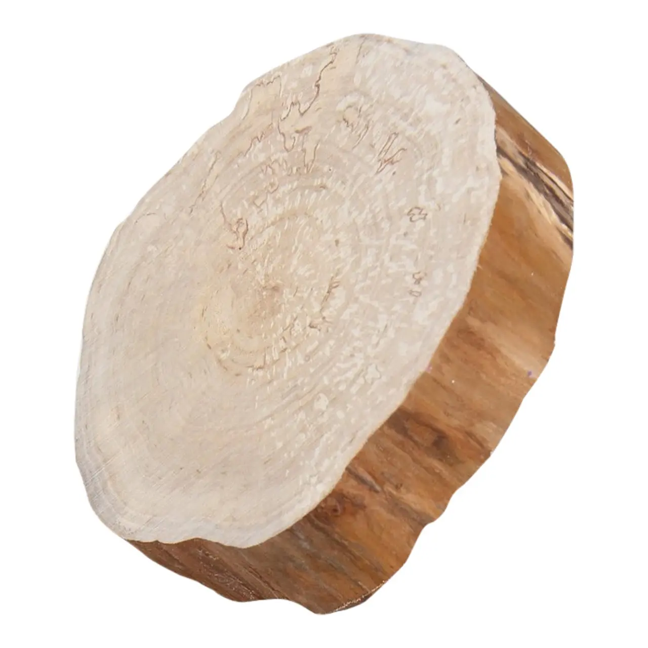 Omdat onze schijven van natuurlijk materiaal zijn, zullen ze nooit helemaal rond zijn, een boomstam in de natuur is dat immers ook niet. We hanteren daarom de langste diameter; deze maat is altijd een benadering.