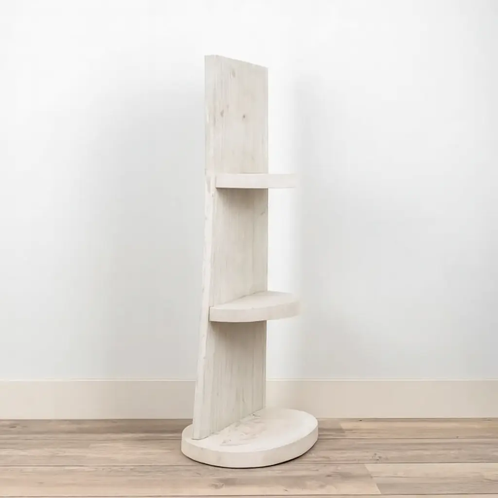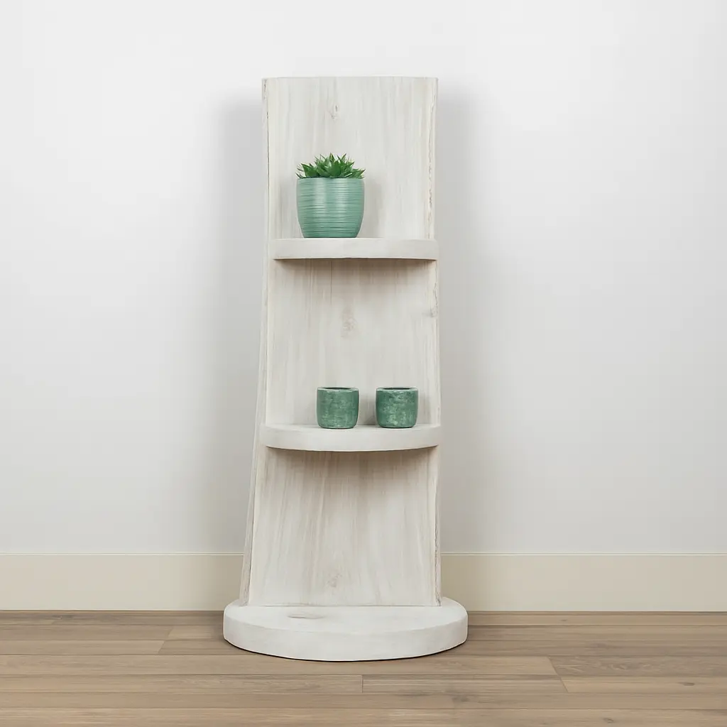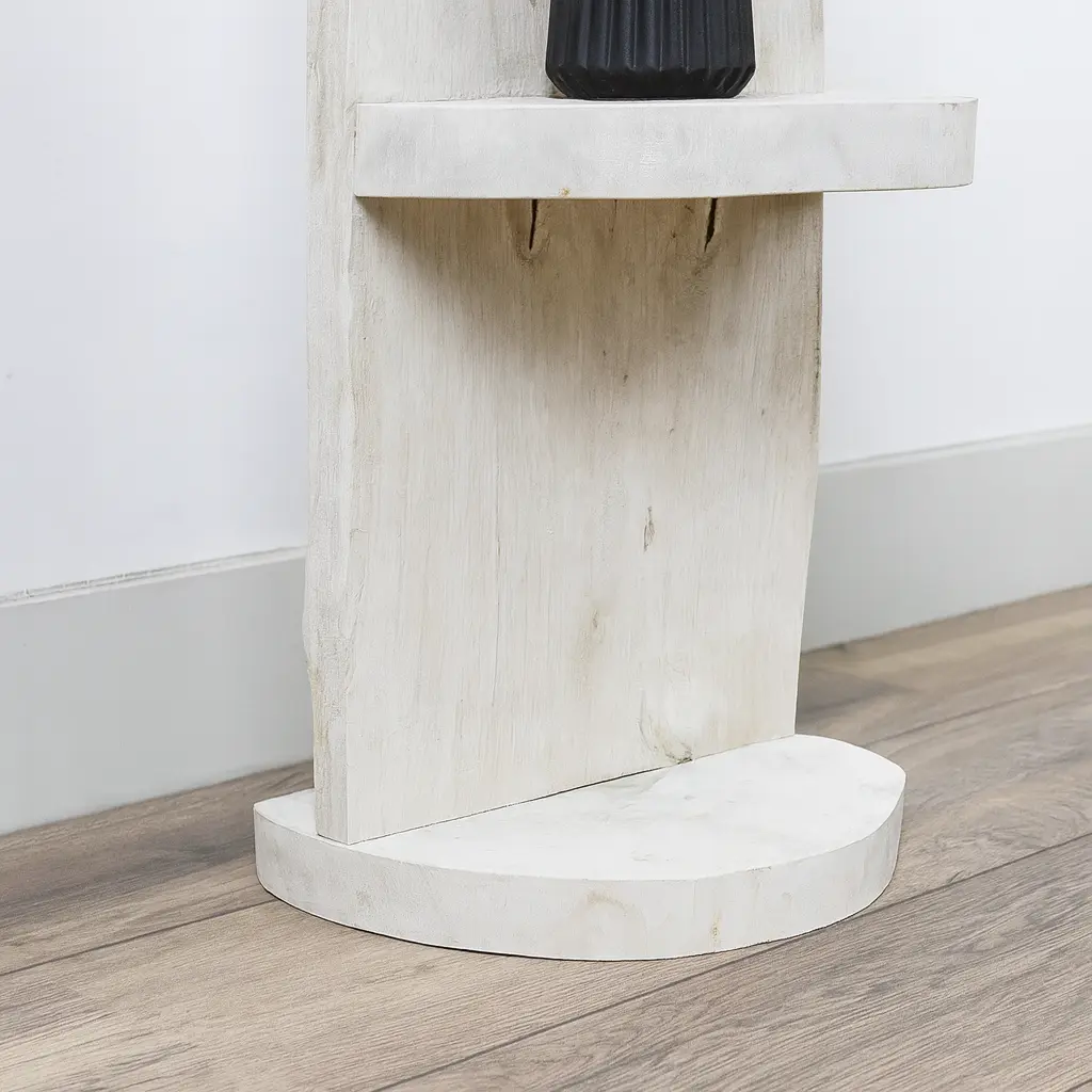 Met twee legplanken biedt dit compacte rek voldoende ruimte voor decoratieve accessoires, planten of kaarsen. Dankzij de natuurlijke vormen van het hout behoudt het rek zijn authentieke uitstraling, terwijl de white wash kleur perfect aansluit bij zowel een modern als landelijk interieur.