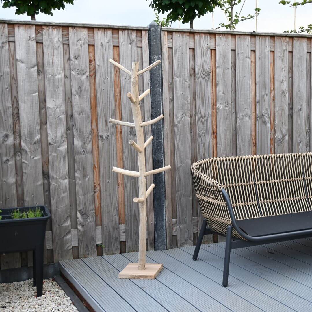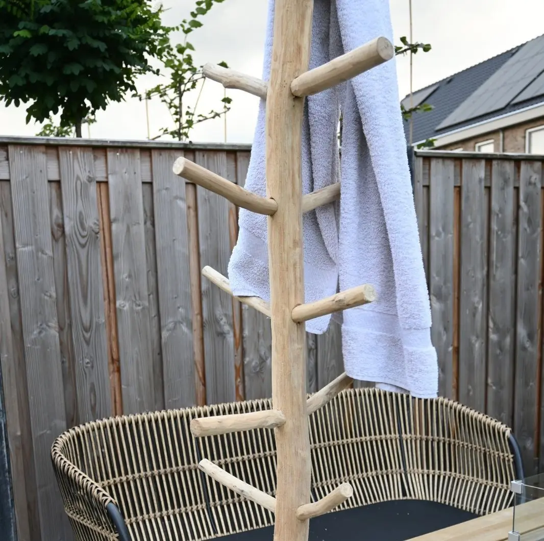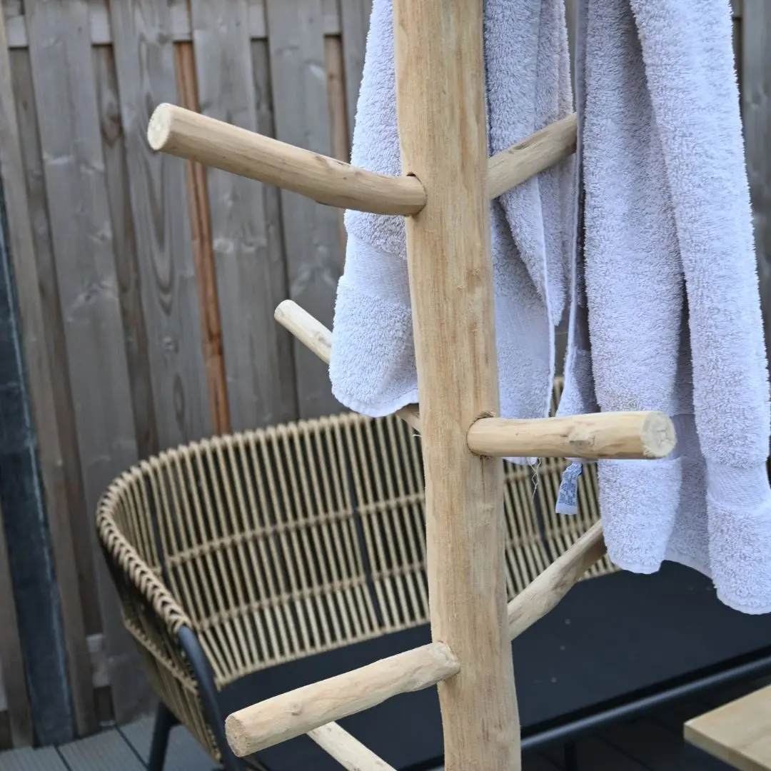 Dankzij het duurzame teakhout en de stevige voetplaat staat de kapstok stabiel en is hij geschikt voor zowel binnen als buitengebruik. De warme houtkleur en organische vorm brengen een vleugje natuur in elke ruimte, perfect in een hal of woonkamer, maar ook zeer geschikt buiten op je terras of bij een zwembad om je badjassen op te hangen.