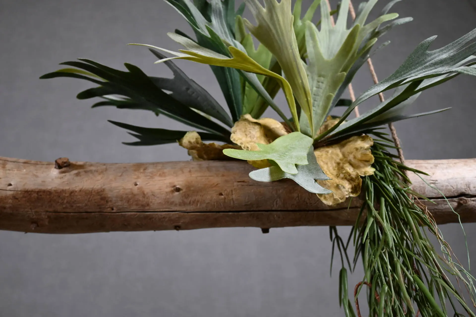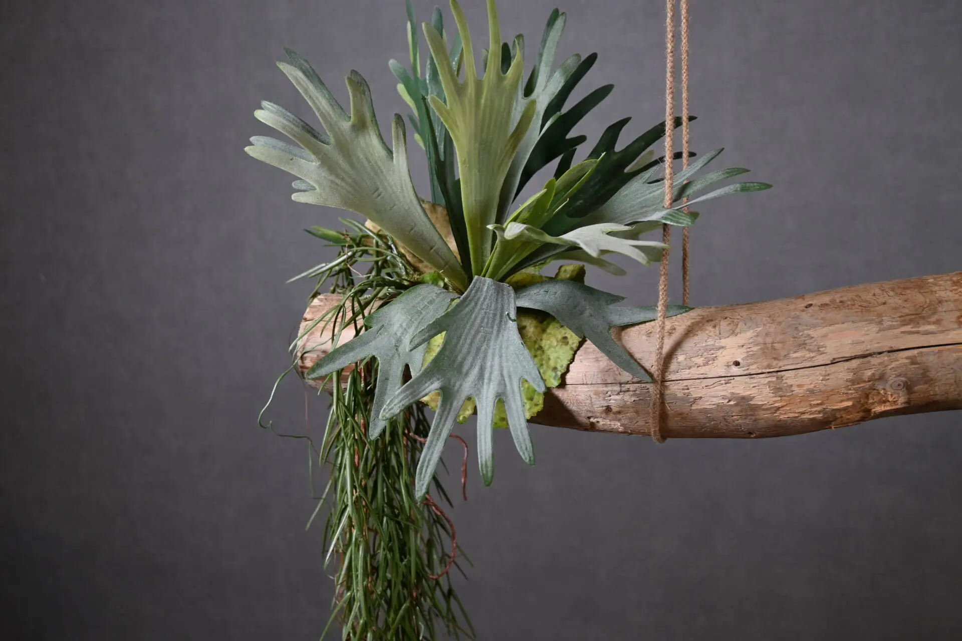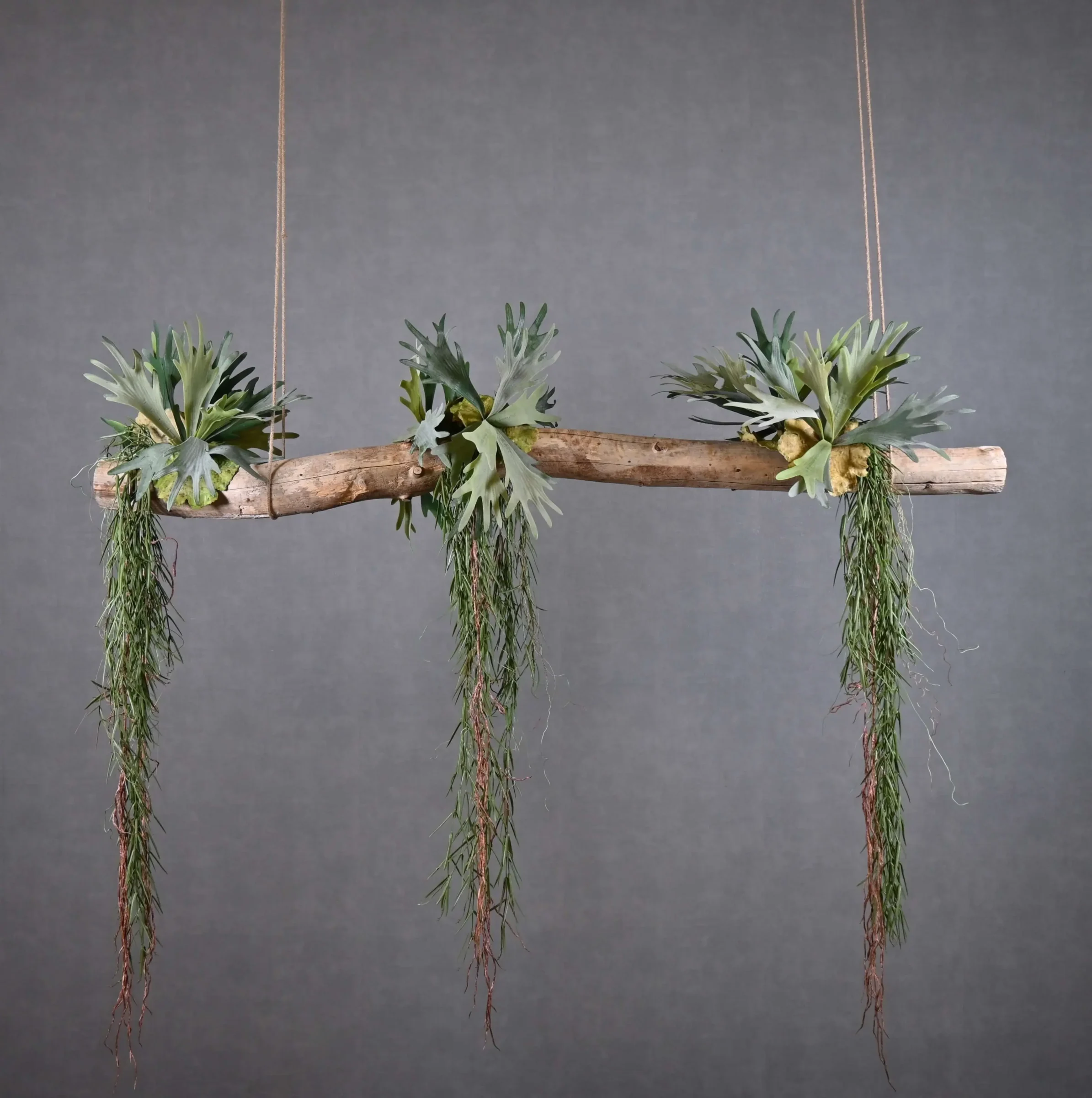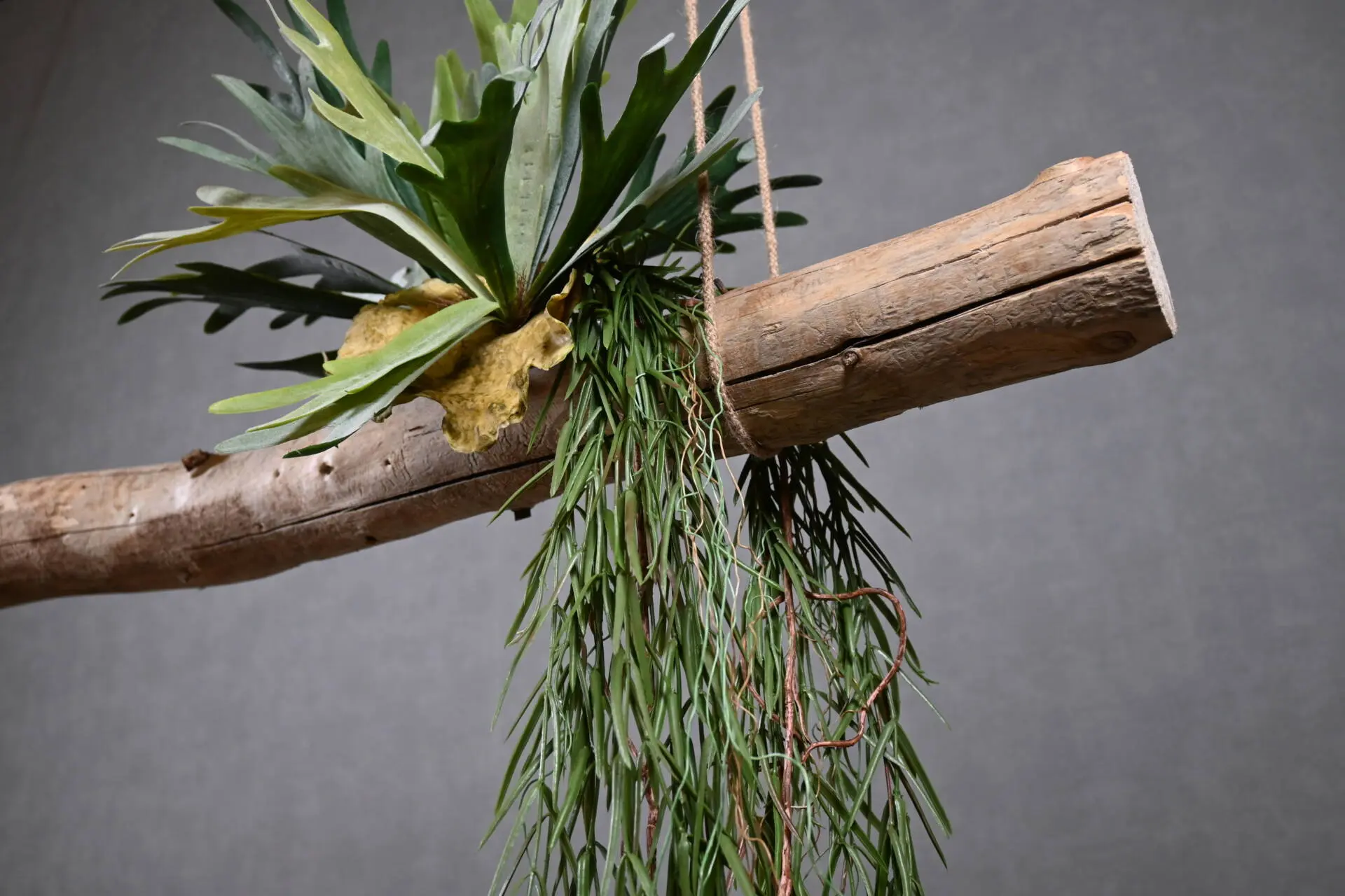 Geef je interieur een natuurlijke en sfeervolle uitstraling met deze stam hanger. De robuuste houten stam is op drie plekken prachtig aangekleed met kunst hertshoornplanten, luchtplanten en groenaccenten. Een echte blikvanger boven de eettafel, in de woonkamer of zelfs in de hal.