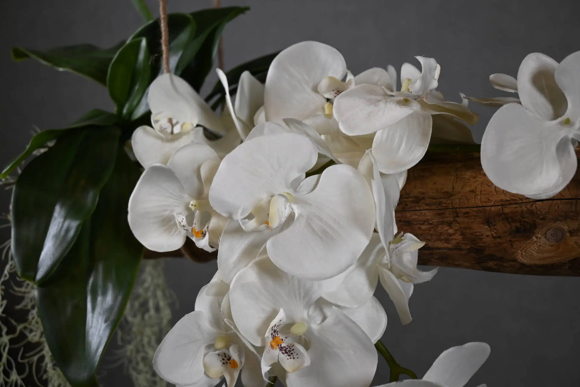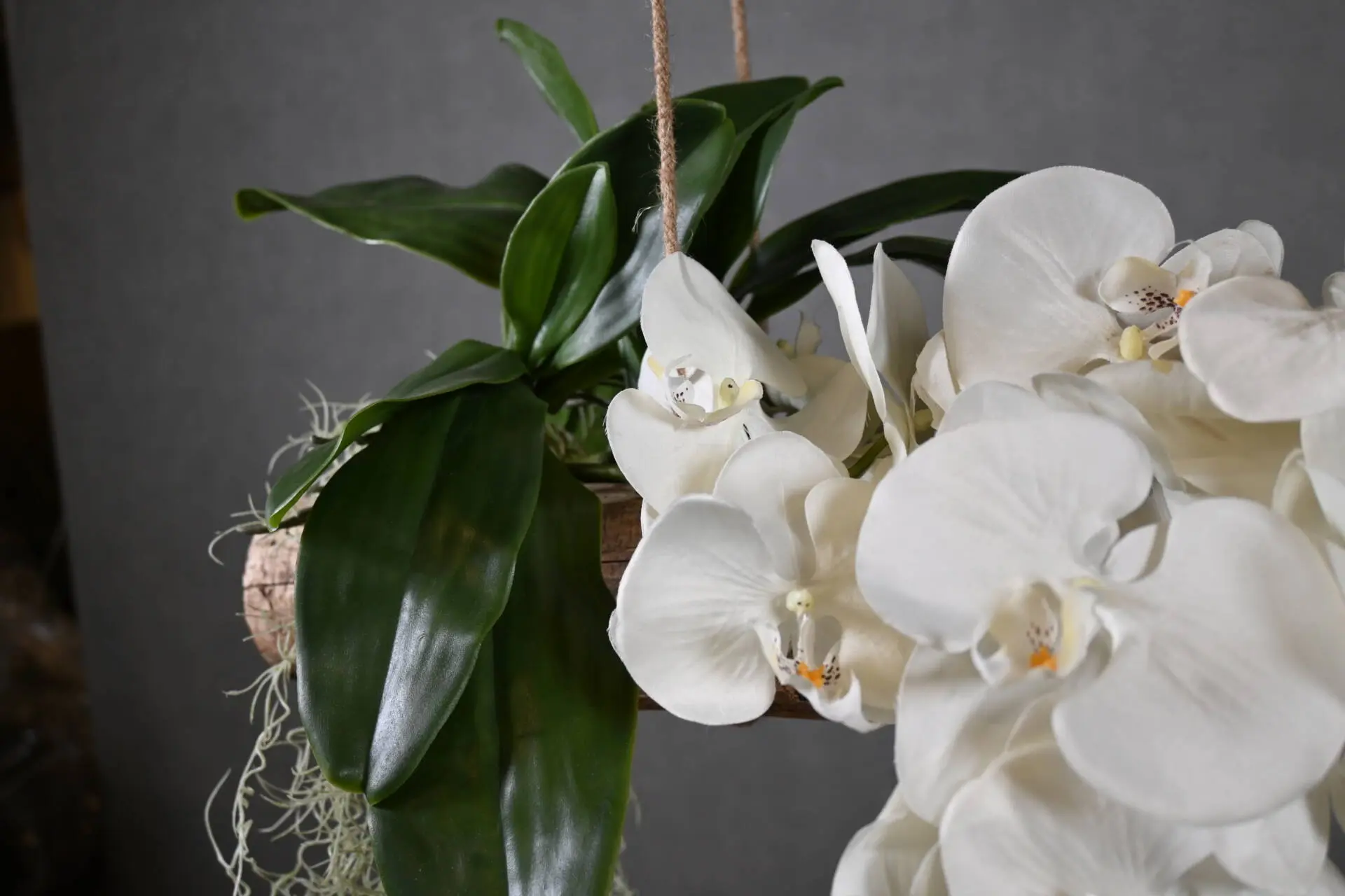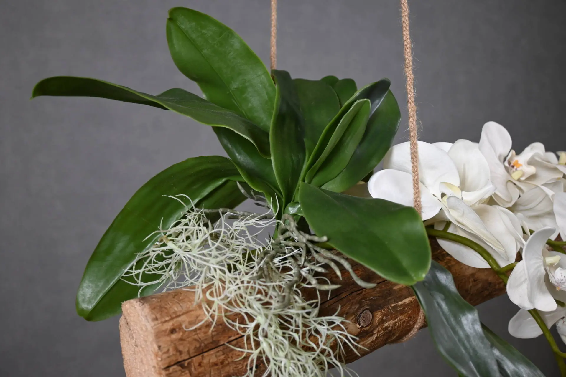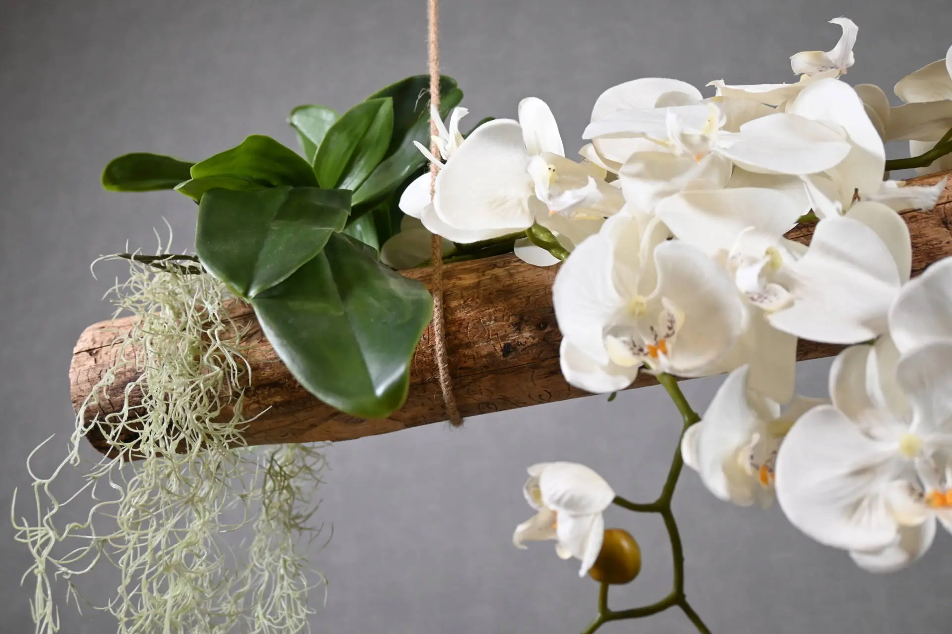 Deze stam hanger brengt een natuurlijke en stijlvolle sfeer in huis. De stevige houten stam is ontschorst en voorzien van een prachtige combinatie van kunstdecoratie: levensechte orchideeën, frisgroene bladeren en hangend groen.