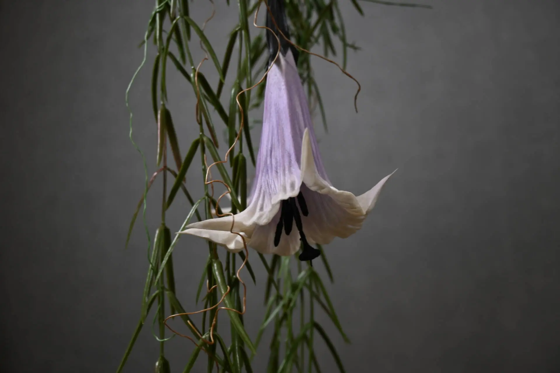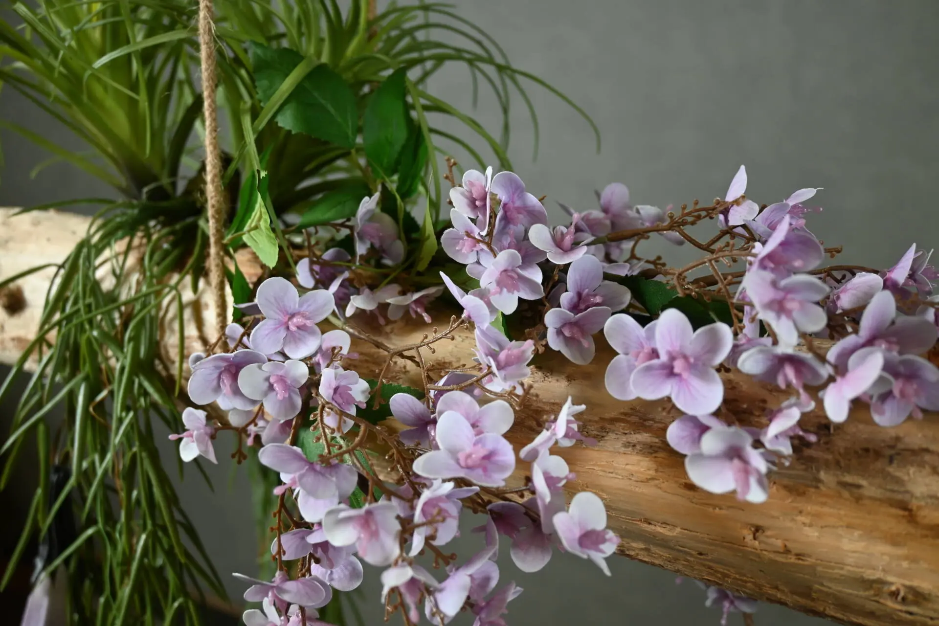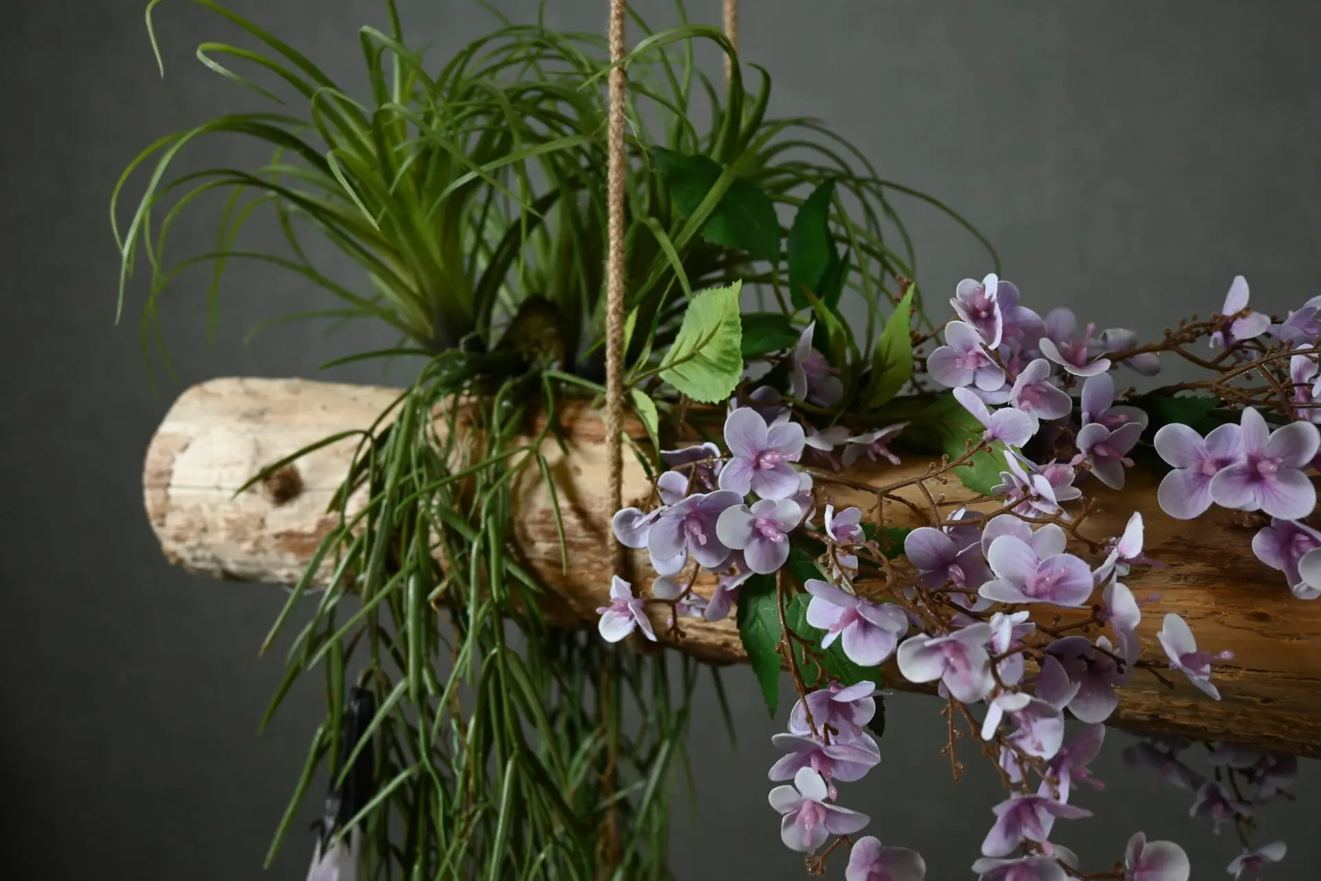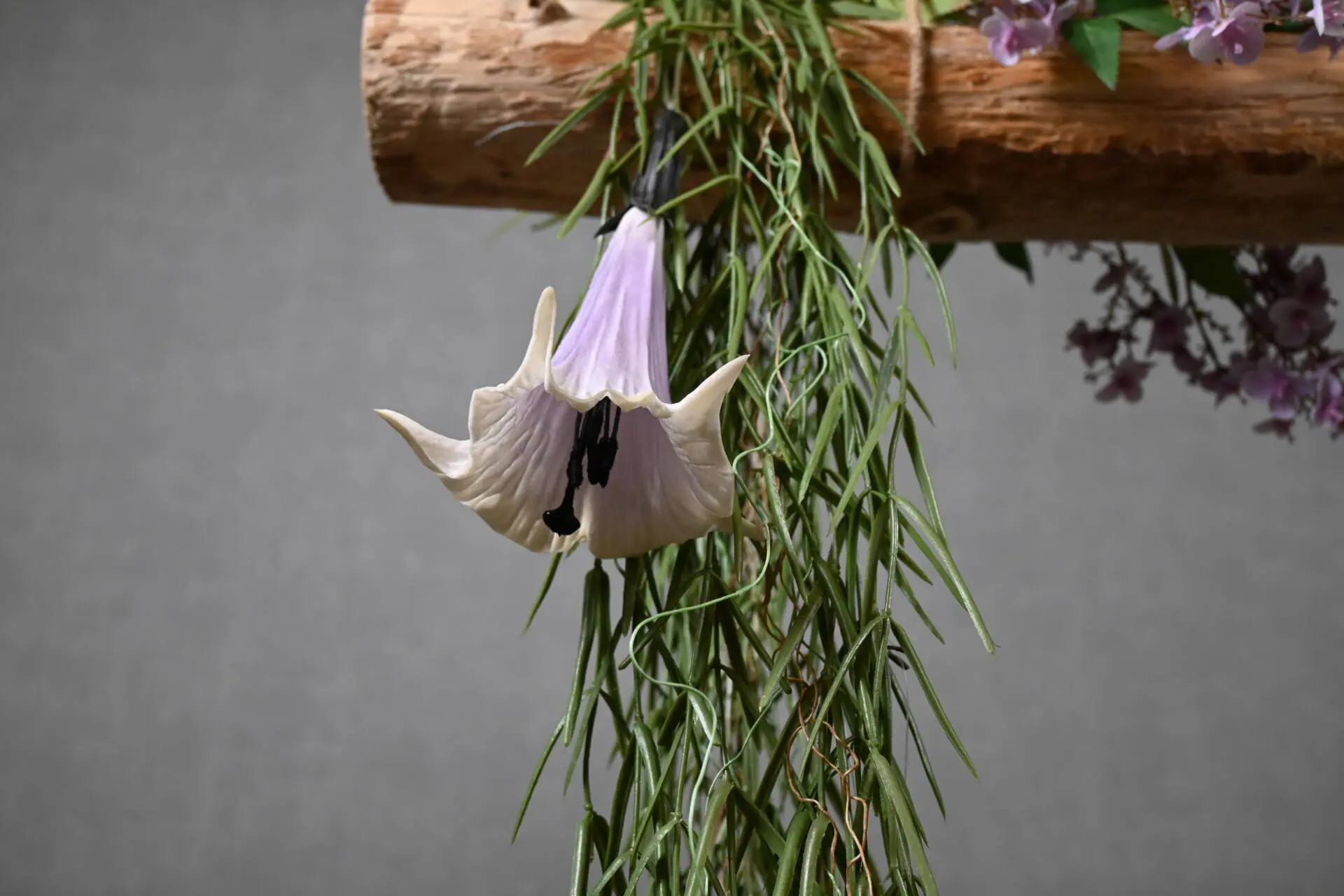Geef je interieur een natuurlijke en sfeervolle uitstraling met deze stam hanger. De robuuste houten stam is prachtig aangekleed met paarse kunst daturabloemen en wilde rozentakken, luchtplanten en groenaccenten. Een echte blikvanger boven de eettafel, in de woonkamer of zelfs in de hal.
