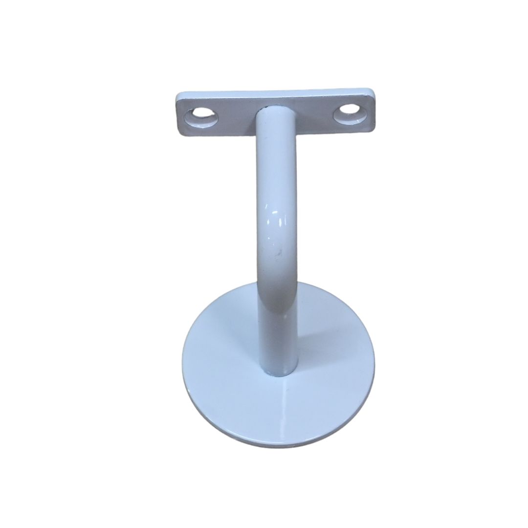 Witte metalen trapleuning houder voor blinde montage tegen de muur, geschikt voor ronde trapleuningen.