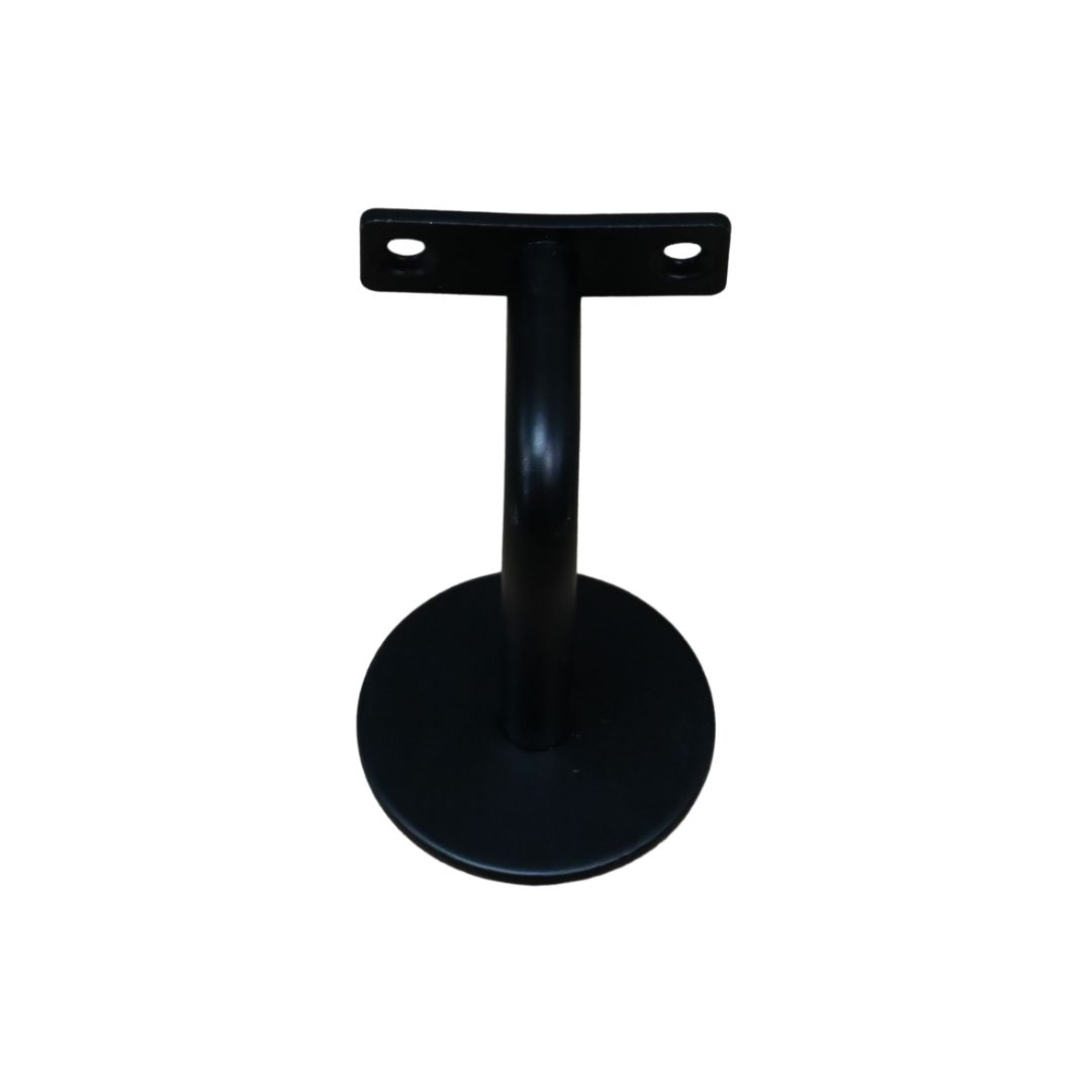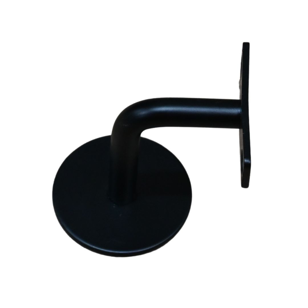Zwarte metalen trapleuning houder voor blinde montage tegen de muur, geschikt voor ronde trapleuningen.