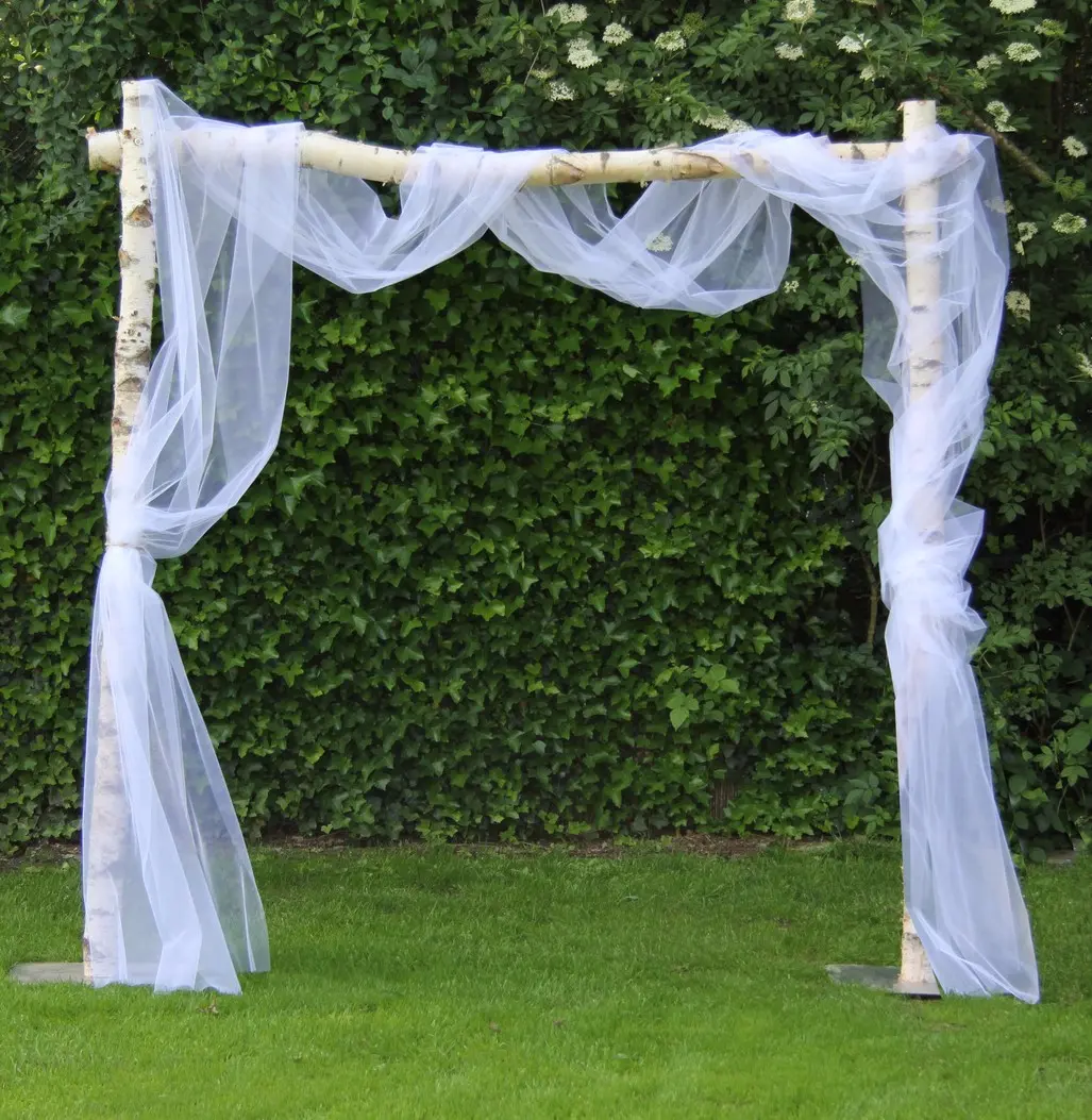 Het prieel is stevig opgebouwd uit berkenstammen en wordt geleverd inclusief wit tule, dat eenvoudig om de stammen kan worden gedrapeerd voor een luchtig en elegant effect. Je kunt het tule naar wens aanvullen met bloemen, groen of verlichting om het nog persoonlijker te maken.