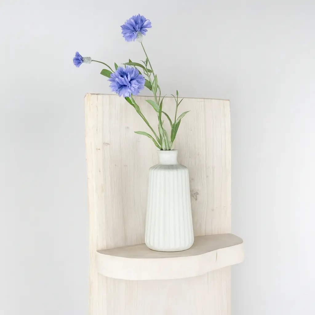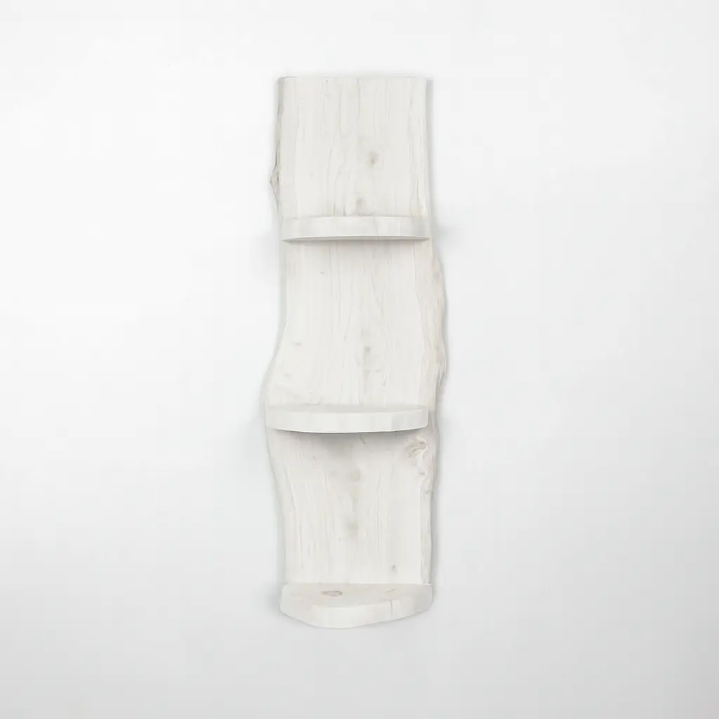 Dit wand boomstamrek uit de Svea-serie is gemaakt van natuurlijk eikenhout. Het hout is ontschorst en behandeld met een moderne White wash olie, waardoor de nerven mooi zichtbaar blijven, maar hij toch een warm tintje krijgt. Met 2 legplanken biedt het rek ruimte voor kaarsen, planten of kleine accessoires.