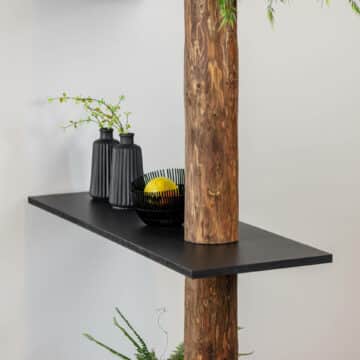 De stam is geolied in een Oak kleur. De planken zijn van MDF fineer en zwart afgelakt. De kast wordt geleverd als bouwpakket inclusief bevestigingsmateriaal met een duidelijke handleiding en is eenvoudig te monteren. De hoogte van de kast is 250 cm. De legplanken zijn verkrijgbaar in twee breedtes, 90 en 120 cm. Wil je een aangepaste maat of heb je vragen, stuur dan een mail naar info@decoratietakken.nl