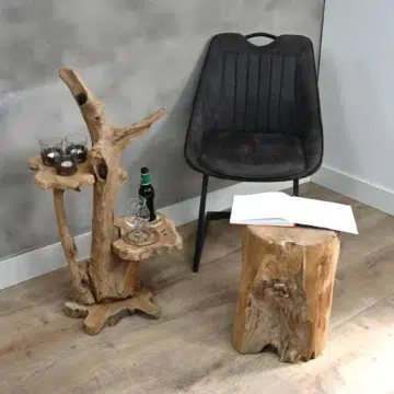 Deze boomstam etagère is een echte blikvanger, gemaakt van massief teakhout met een karakteristieke natuurlijke vorm. Elk stuk wordt met de hand vervaardigd, waardoor geen twee exemplaren hetzelfde zijn. De teakhouten stam met zijn robuuste structuur en warme kleur brengt een pure, organische uitstraling in je interieur.