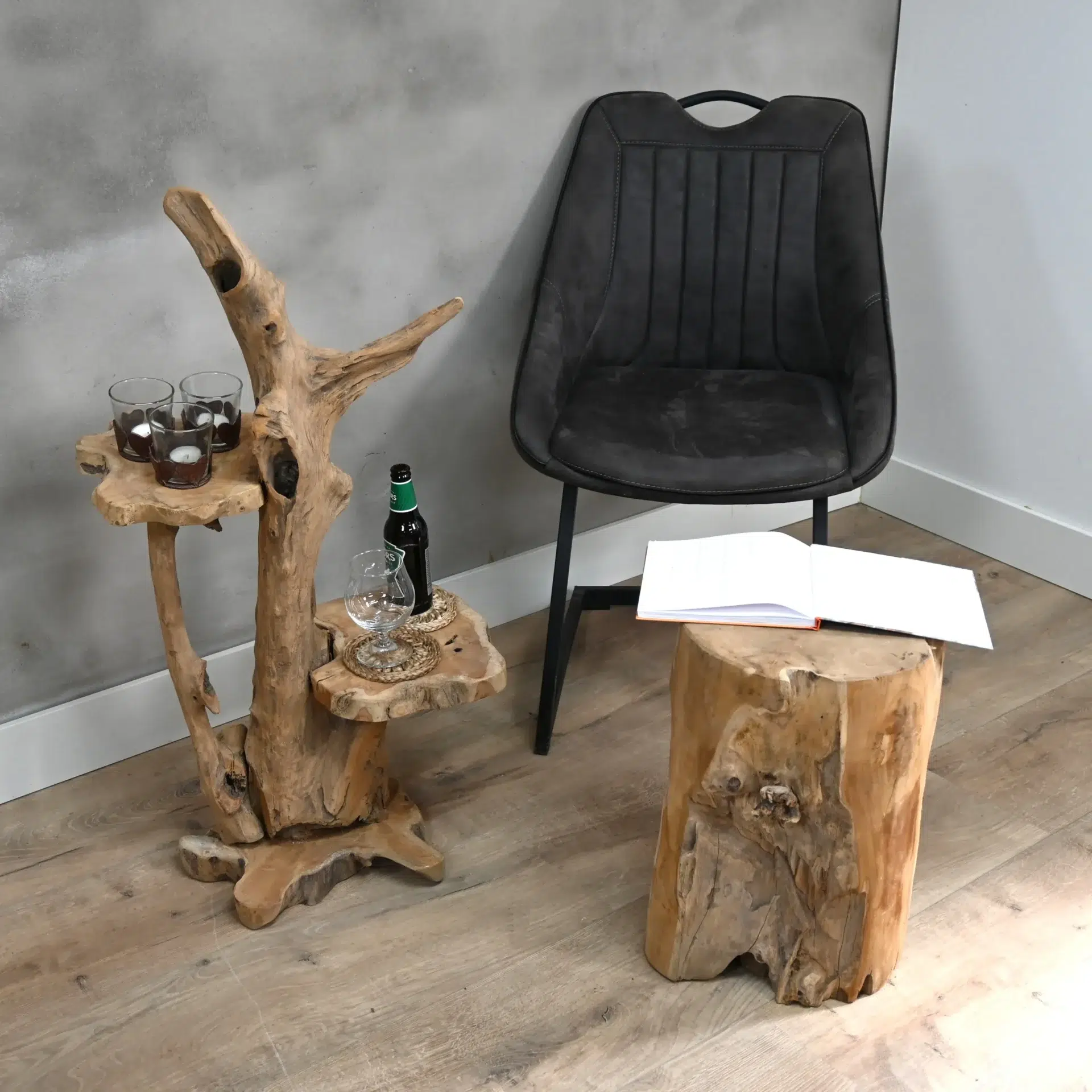 Met zijn natuurlijke vormen, unieke nerven en tijdloze karakter past deze teak etagère naadloos in landelijke, industriële of bohemian interieurs.