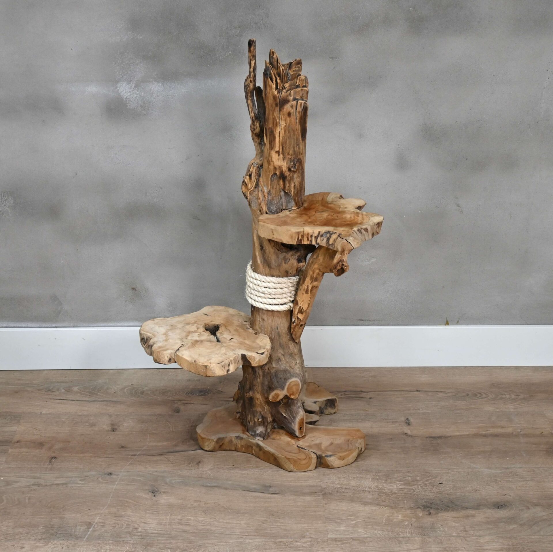 Dankzij de warme houtkleur en natuurlijke afwerking past deze teak krabpaal perfect in landelijke, industriële of bohemian interieurs — een stijlvol alternatief voor standaard kattenspullen.