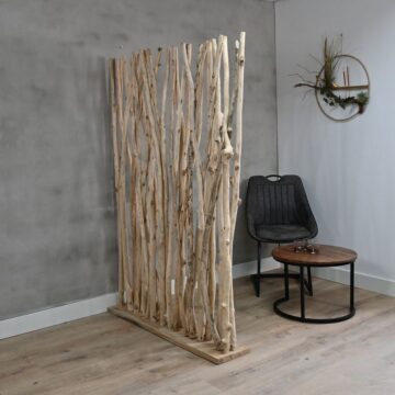 Dankzij de natuurlijke vorm en kleur van het teak is elke roomdivider uniek. De open structuur zorgt voor een subtiele scheiding tussen ruimtes, zonder het licht weg te nemen.