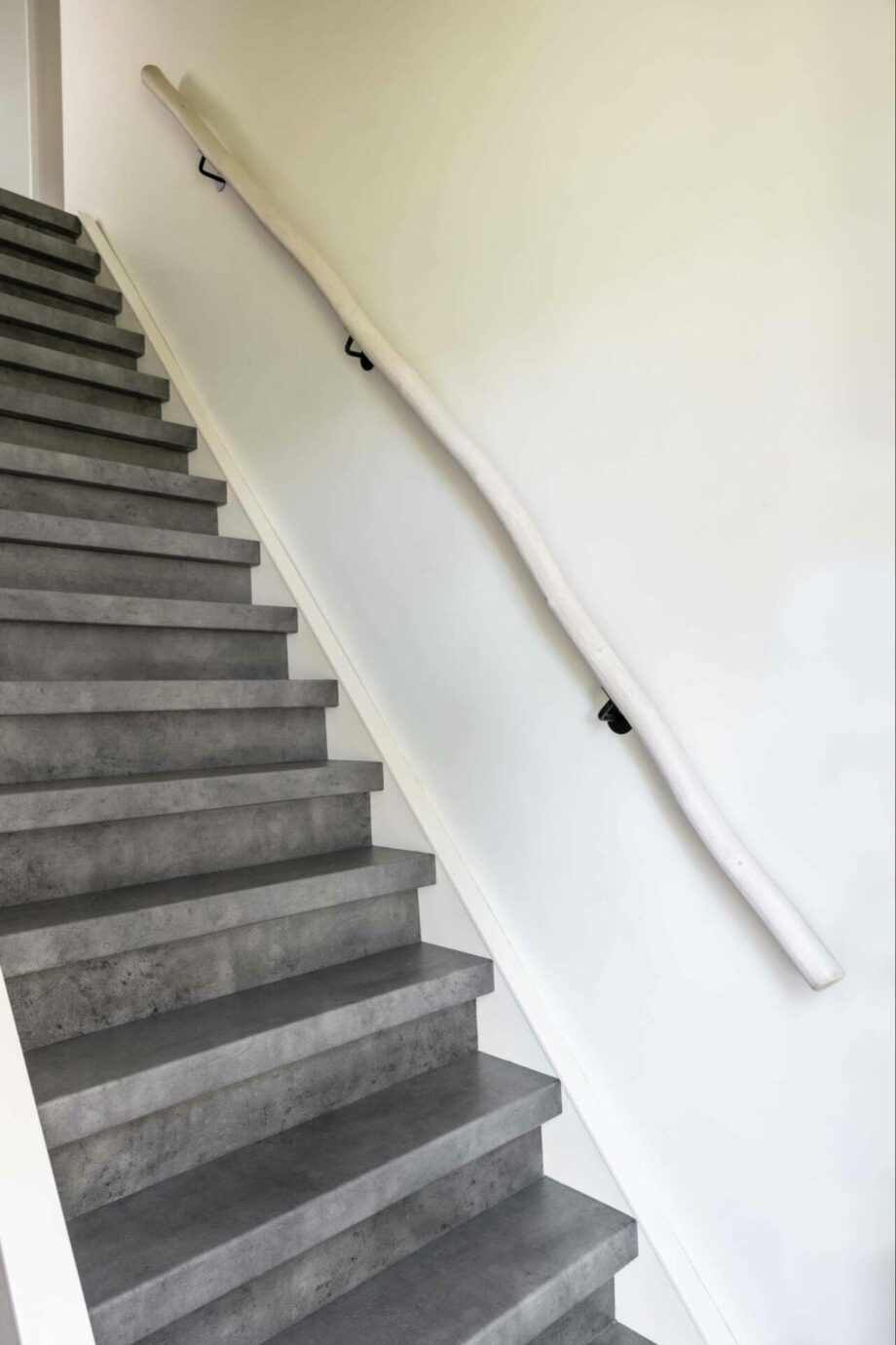 Boomstam als trapleuning met een oliebehandeling in de kleur White wash. Op maat gemaakt van 30 t/m 400cm. Doorsnee 4-6 cm.